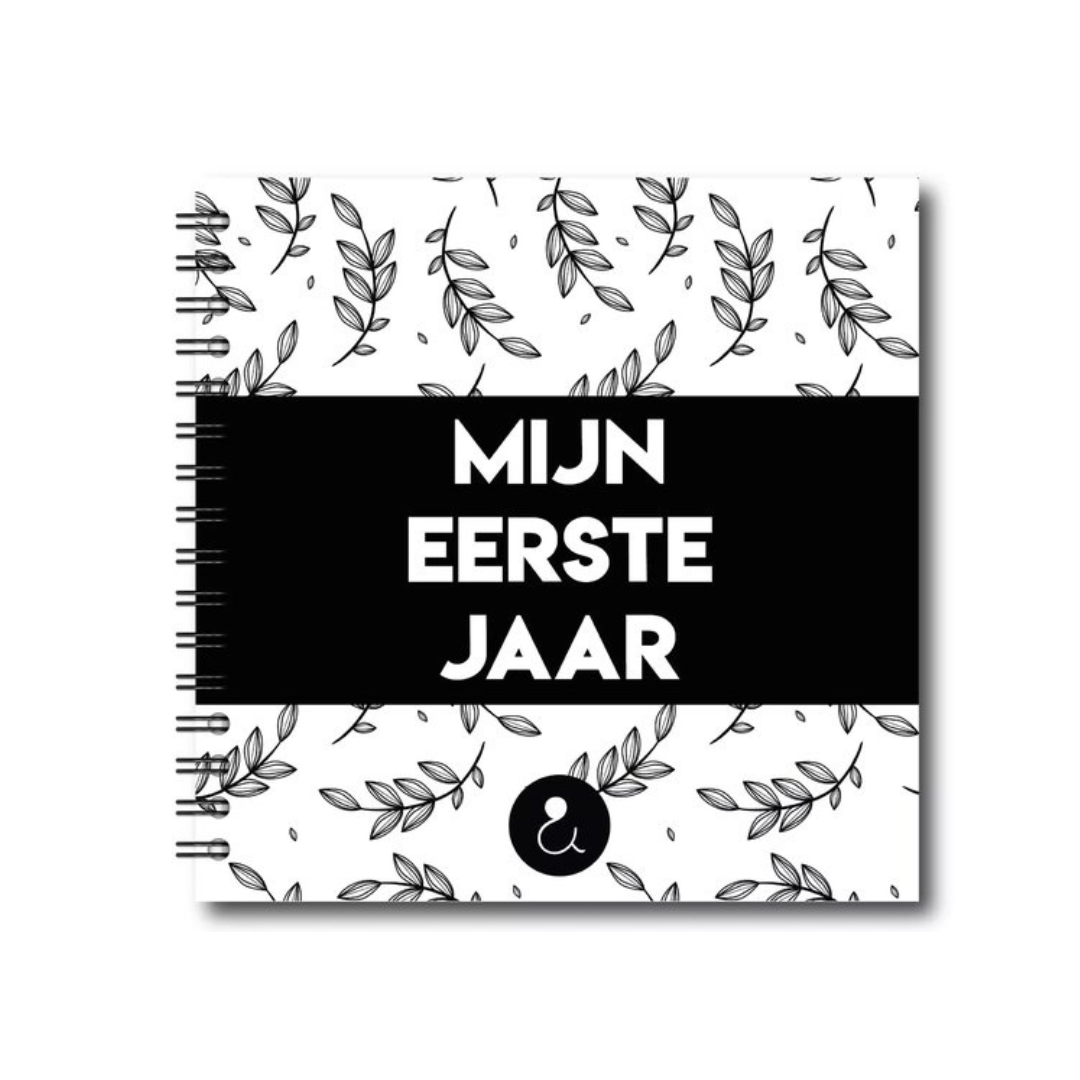 • Kleur invulboek Baby's eerste jaar: Wit met zwarte blaadjes (botanical) en een zwarte band met tekst