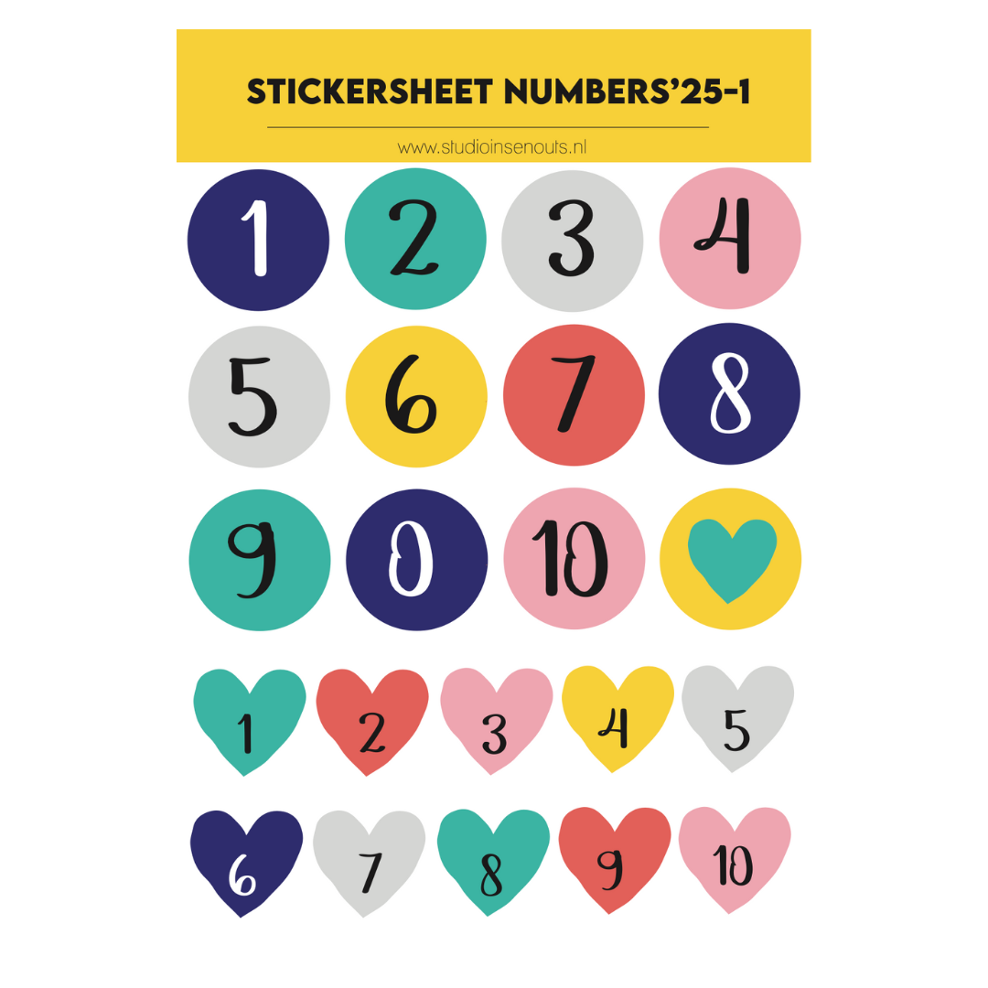 - Aantal stickers: 20 ronde cijferstickers + 10 hartjes cijferstickers