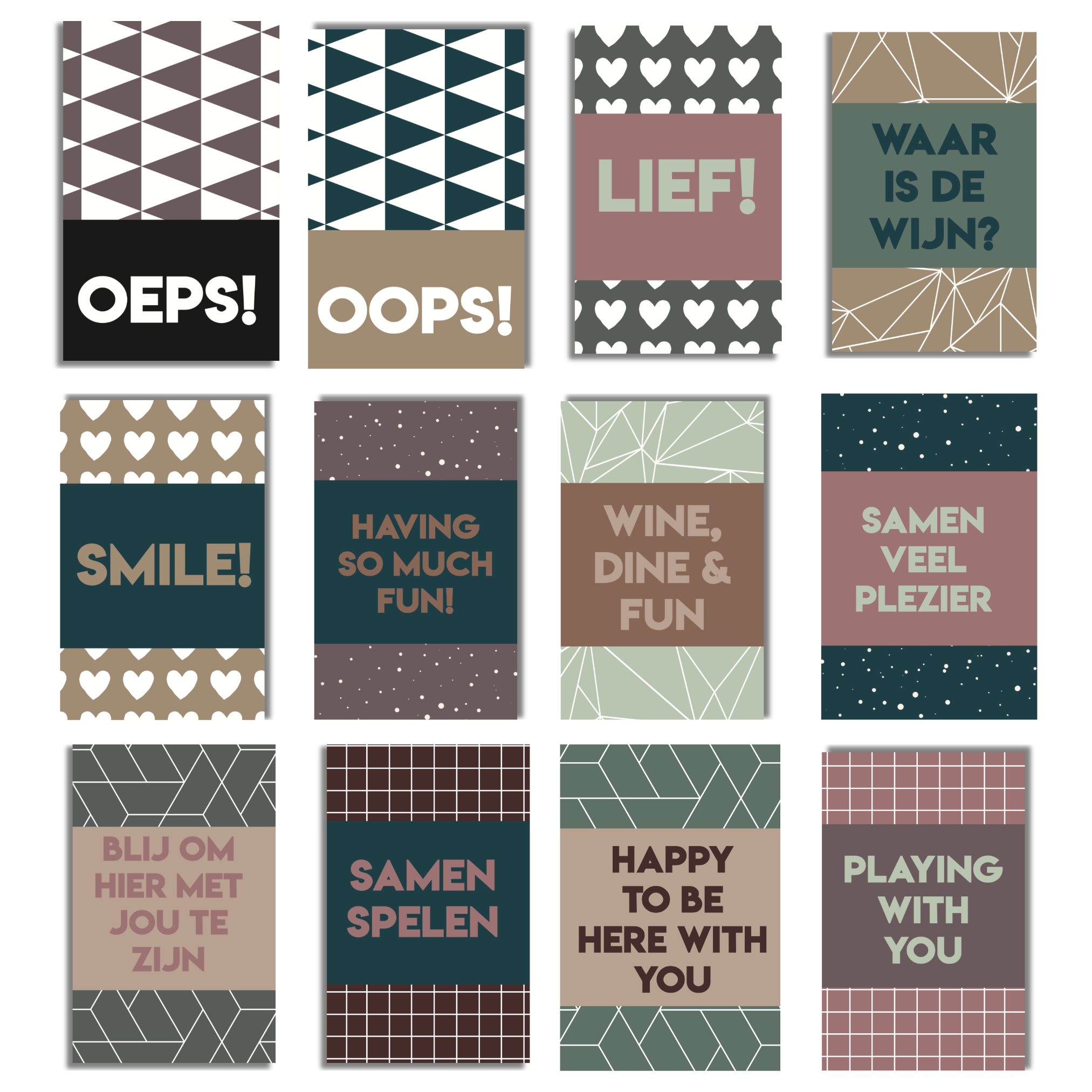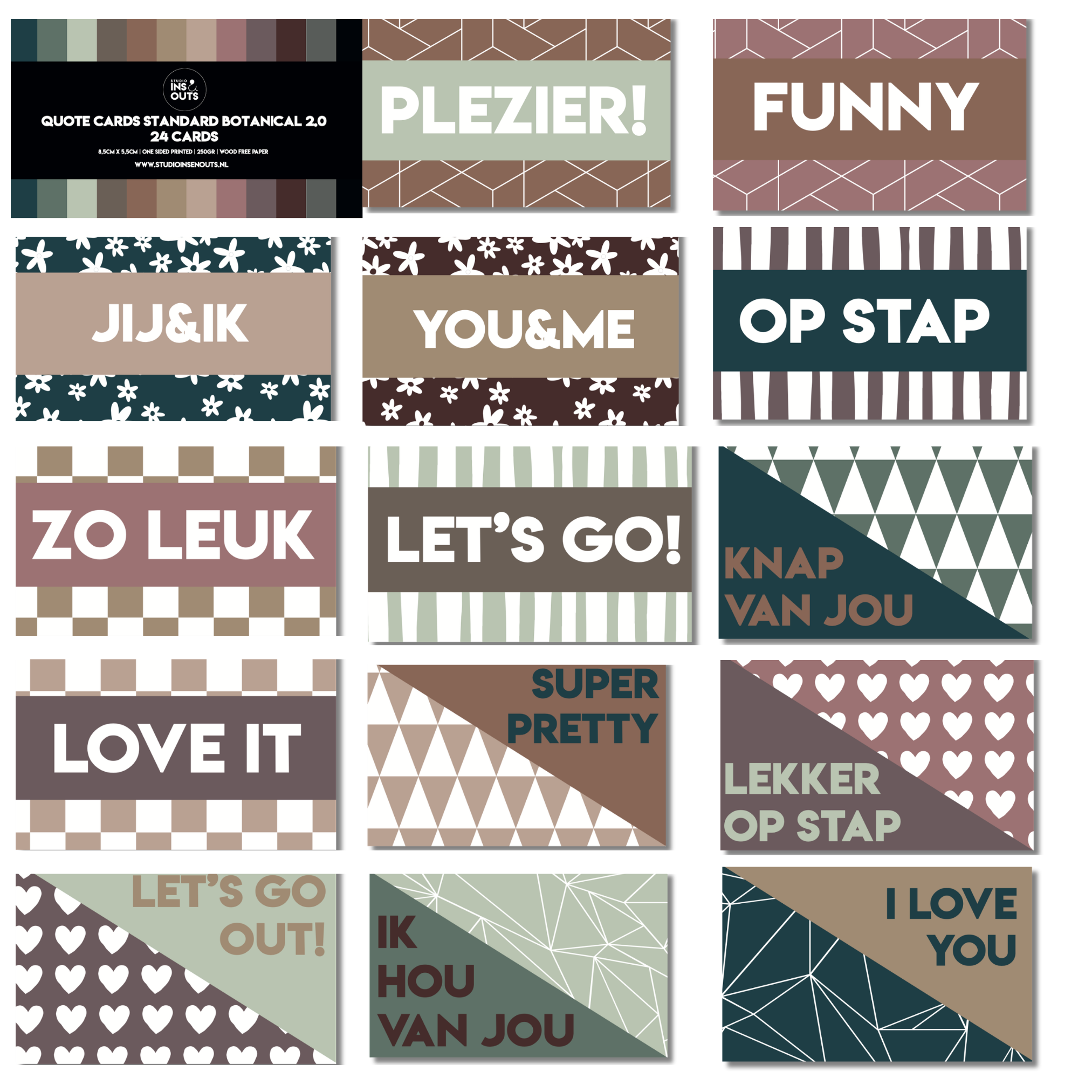 De set Quote Kaartjes Botanical 2.0 bestaat uit 24 stevige mini kaartjes van 4 x 6 cm. Elk kaartje is enkelzijdig bedrukt met een vrolijke quote of motiverende tekst, afgewisseld met een opvallend grafisch patroon in warme aardetinten zoals groen, taupe, roze en terracotta. Je ontvangt per set 24 verschillende kaartjes, elk met een unieke boodschap in het Nederlands of Engels.