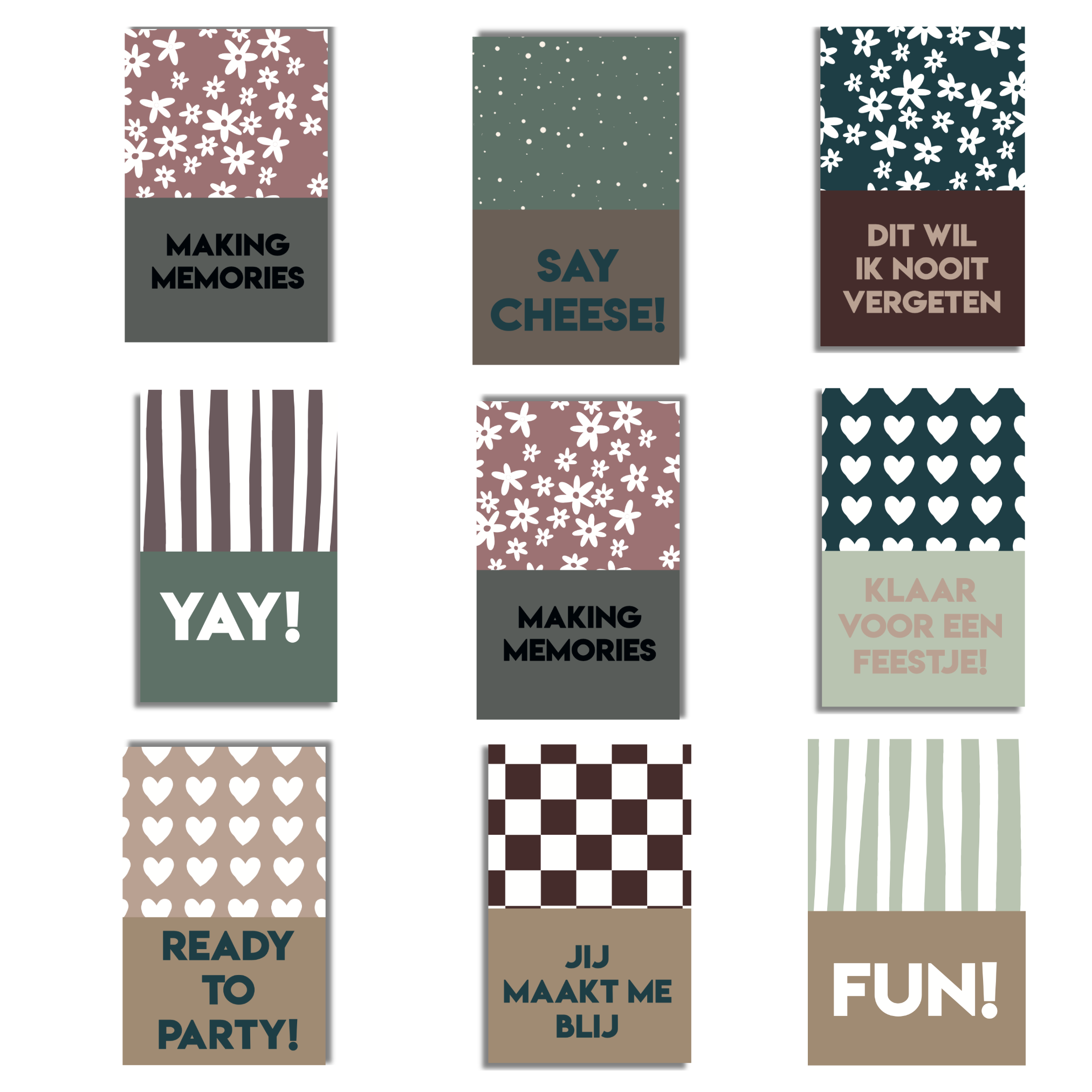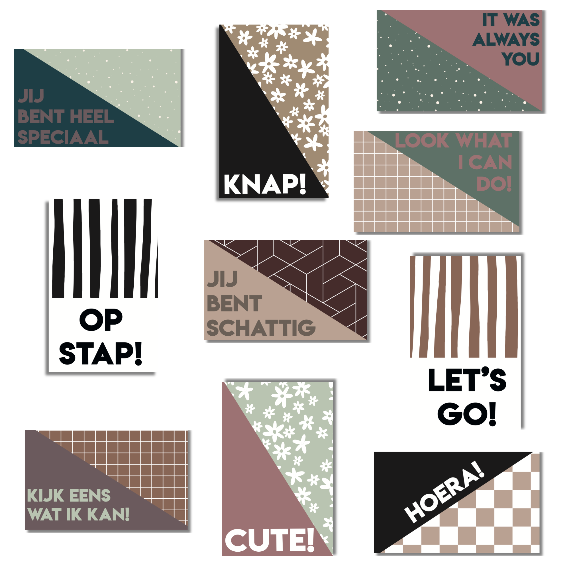 - Type: Mini kaartjes met quotes en botanische, grafische patronen