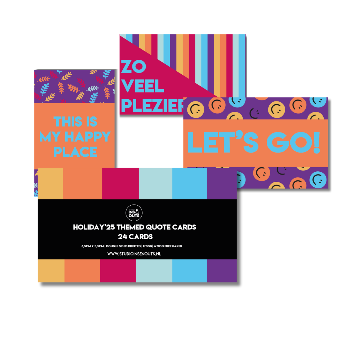 Deze leuke set Quote Kaartjes Holiday ’25 bestaat uit 24 stevige mini kaartjes van 4 x 6 cm. Elk kaartje is enkelzijdig bedrukt met een vrolijke quote of motiverende tekst, afgewisseld met speelse grafische prints in sprankelende vakantiekleuren zoals oranje, rood, paars, blauw, geel en turquoise. Je ontvangt per set 24 verschillende kaartjes, elk met een unieke boodschap in het Nederlands of Engels.