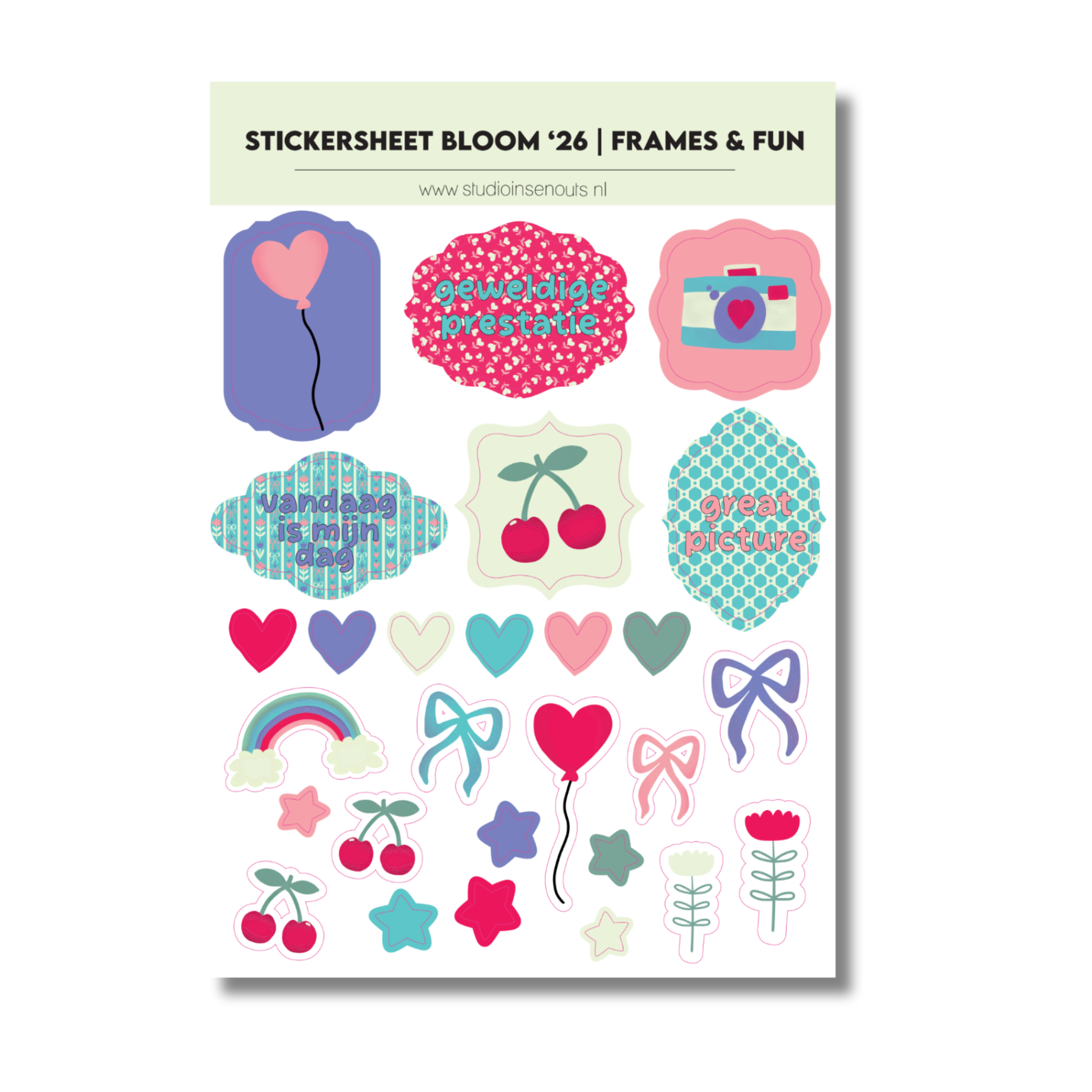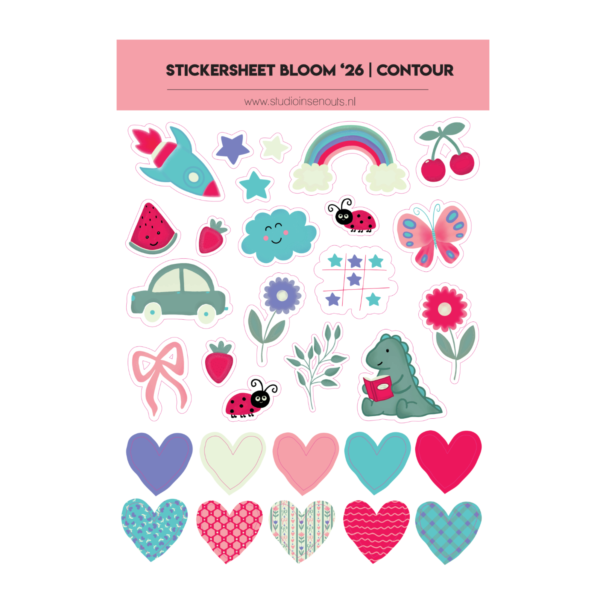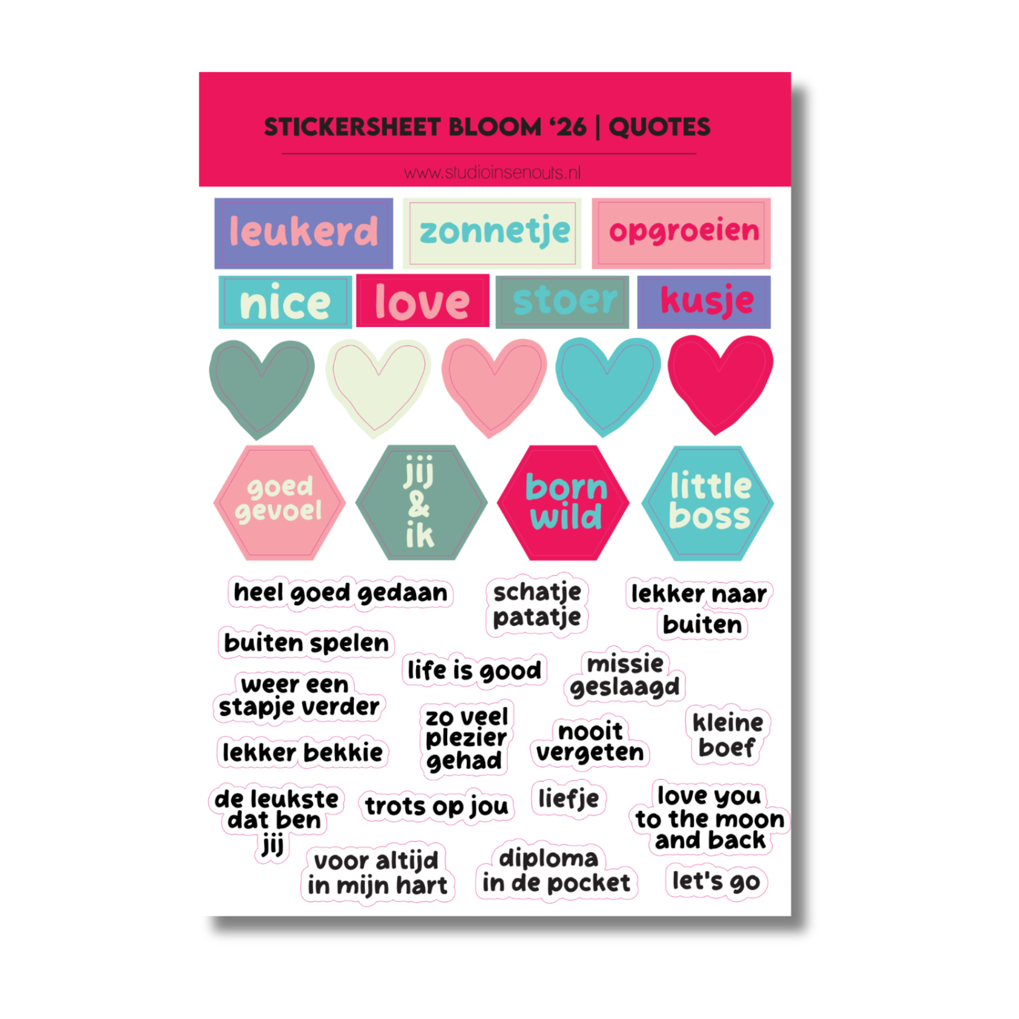 Stickervellen: 4 vellen (circles, quotes, contour en frames & fun) met ronde stickers, tekststickers, illustraties, labels en kleine decoratieve elementen die perfect aansluiten bij de Bloom stijl.