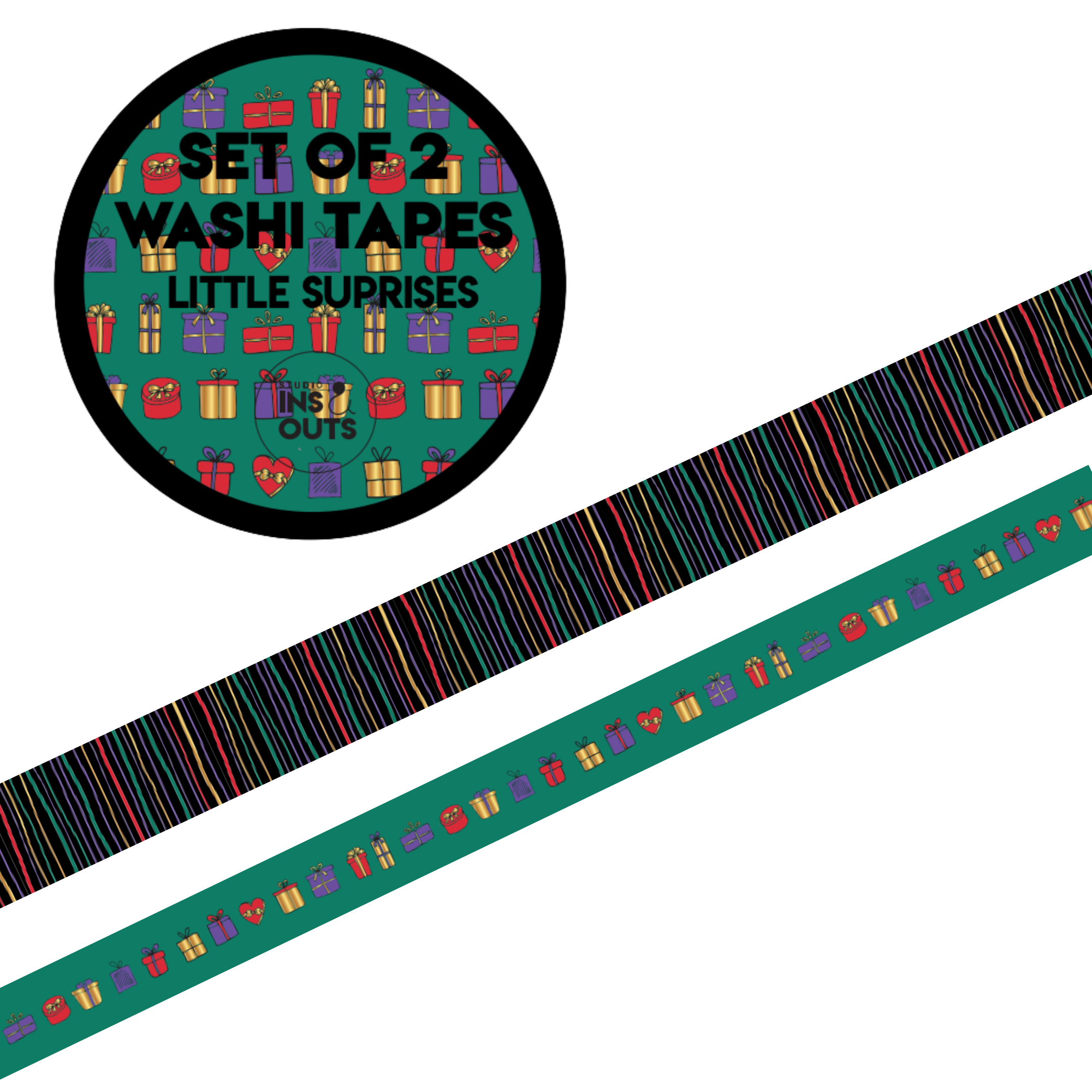 Washi tapes set van 2: Een smalle tape met een speels lijnpatroon en een bredere tape met cadeautjes en hartjes, perfect om pagina’s of foto’s af te werken.