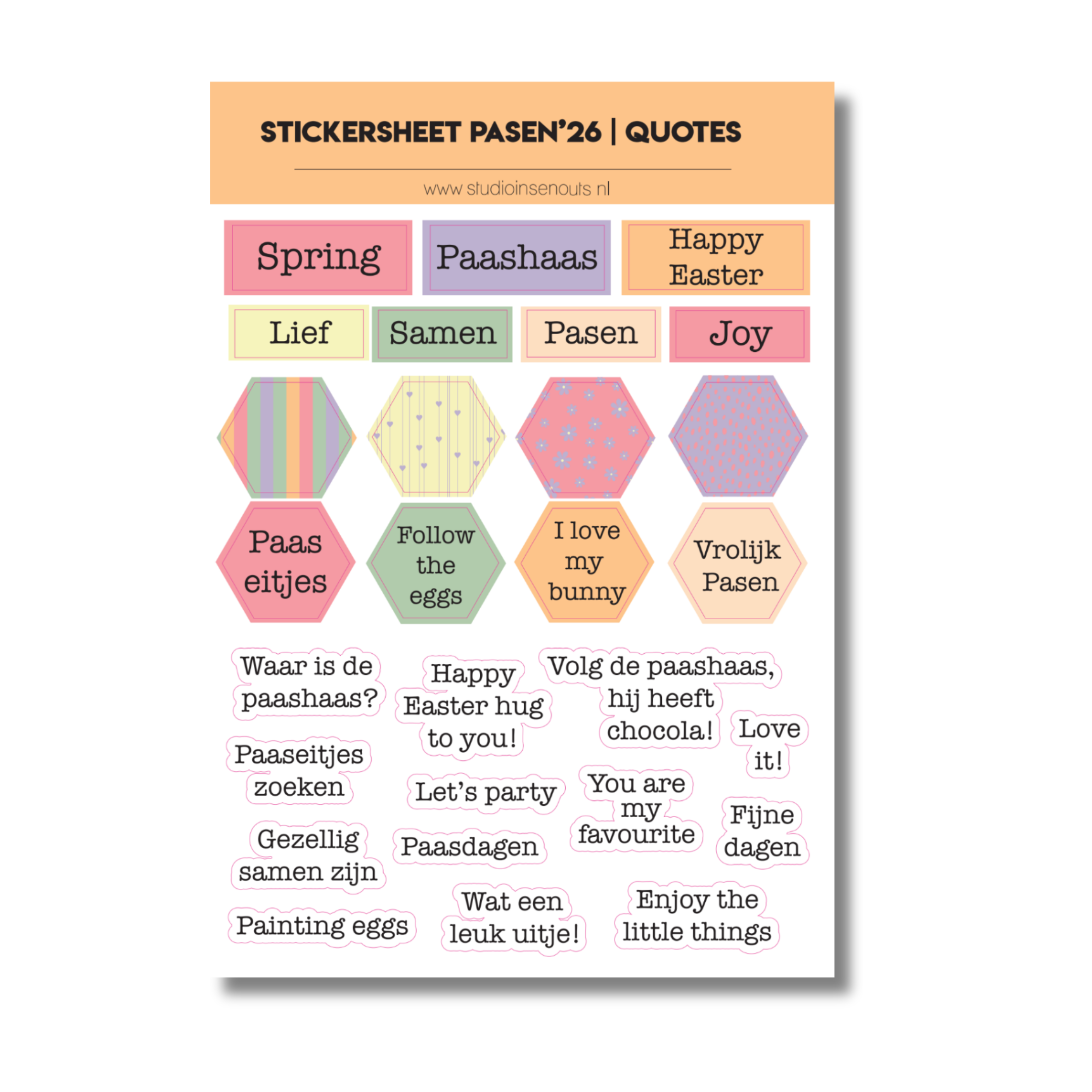 Het stickervel Quotes Pasen’26 van Studio Ins & Outs bestaat uit tekststickers met korte woorden en zinnen die passen bij Pasen en het voorjaar. De quotes zijn gericht op samen zijn, leuke momenten en kleine paasactiviteiten. Het stickervel is geschikt voor gebruik in scrapbooks, invulboeken, fotoboeken, planners en journals waarin paasdagen en lentemomenten worden vastgelegd.
