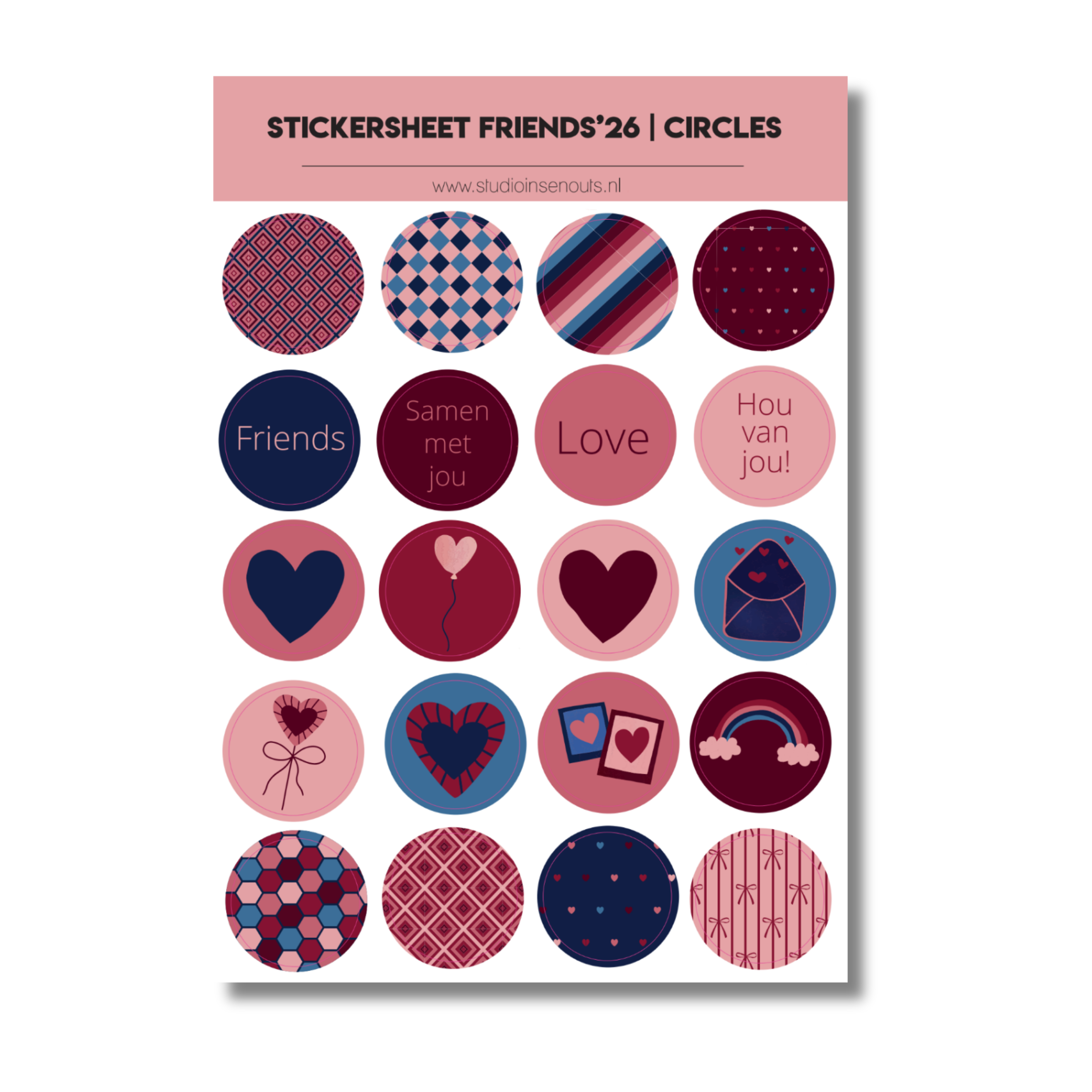 Het Stickervel Circles Friends’26 van Studio Ins & Outs is speciaal ontworpen voor creatieve projecten rondom vriendschap, liefde en Valentijn. Dit stickervel bevat ronde stickers in een warme kleurenmix van lichtroze, oudroze, rood, bordeaux, blauw en donkerblauw. De cirkelvormige stickers zijn voorzien van speelse patronen zoals hartjes, strikjes, ruiten, hexagon, hokjes en strepen, waardoor ze perfect passen bij romantische en liefdevolle scrapbookpagina’s.