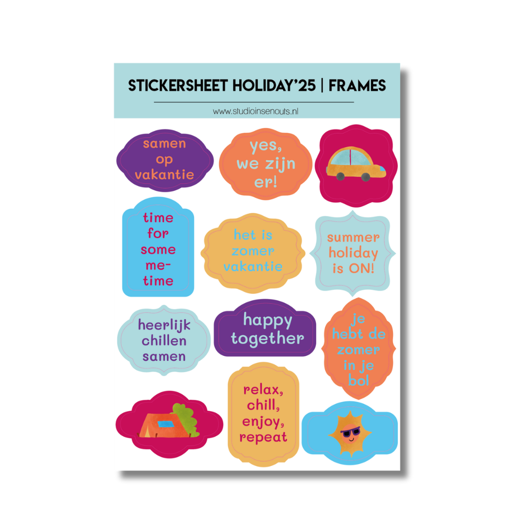 Dit vrolijke stickervel Frames Holiday’25 bevat 12 unieke stickers met zomerse frames, banners en kleine illustraties in frisse vakantiekleuren. Op het vel vind je zowel Nederlandse als Engelse vakantie quotes, zoals “samen op vakantie”, “relax, chill, enjoy, repeat”, “happy together”, “het is zomervakantie” en “yes, we zijn er!”. De stickers zijn aangevuld met plaatjes als een zonnetje met zonnebril, een tent, een blauwe auto en kleurrijke printjes. Voor elk vakantieproject, zomers dagboek of gezellig moment een passende sticker!