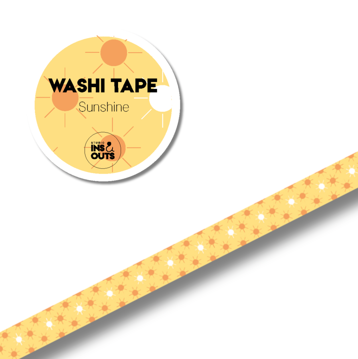 De tape is 1,5 cm breed en bedrukt met een zomers patroon van vrolijke zonnetjes in oranje en wit op een zachte gele achtergrond. De zonnige stijl past perfect bij zomerse thema’s, vakanties en blije momenten. De tape is gemaakt van papierachtig masking tape dat makkelijk met de hand afscheurbaar is en ideaal voor creatief gebruik.
