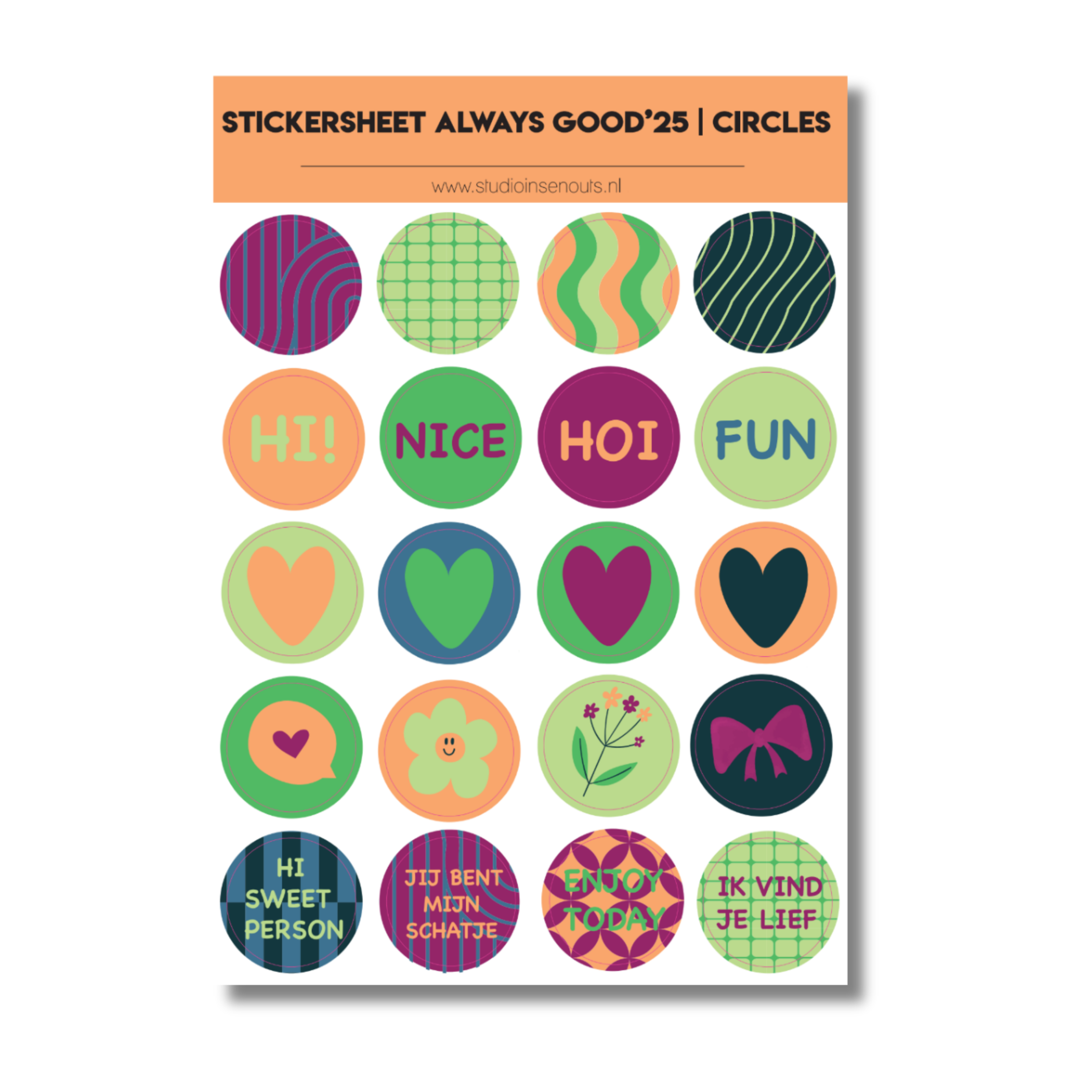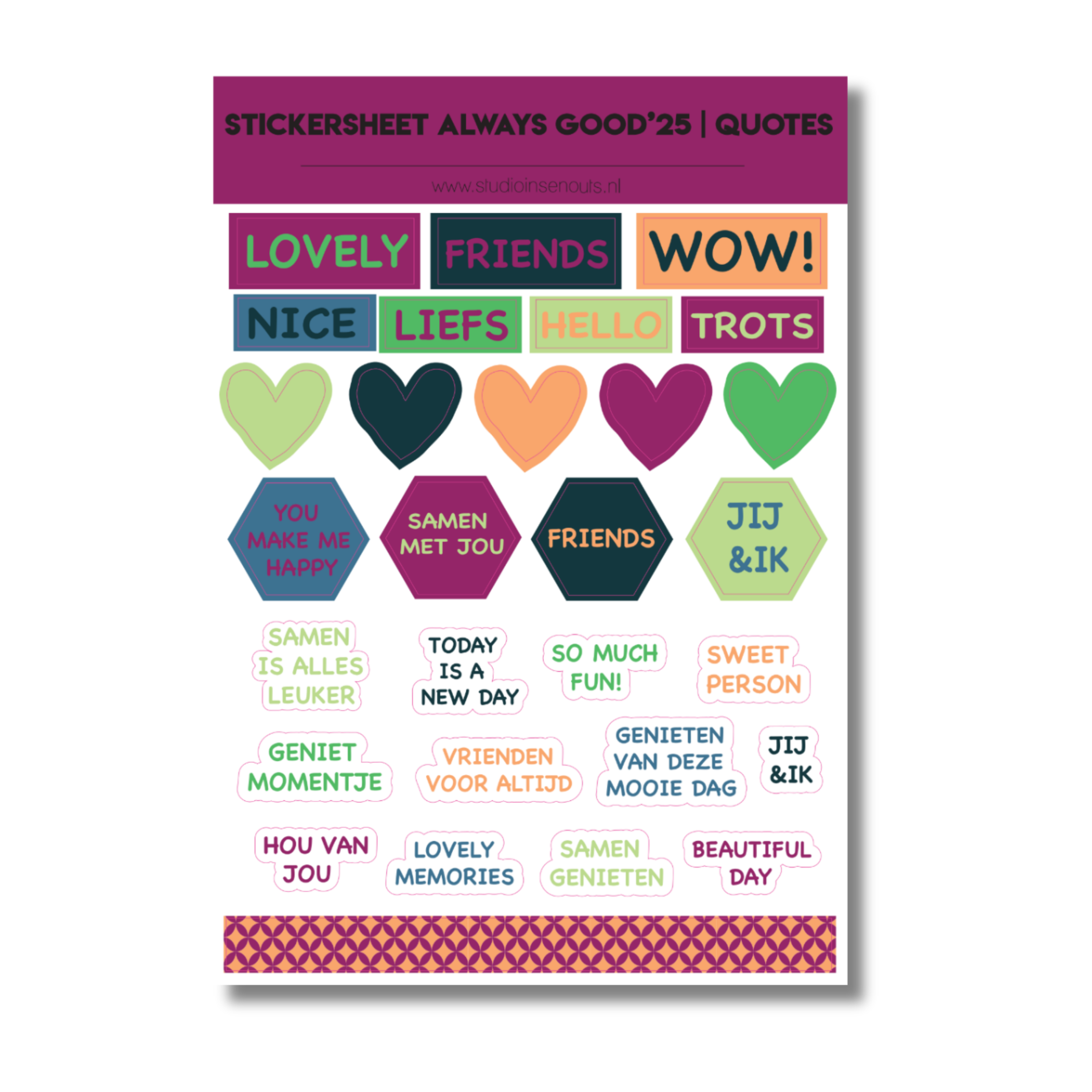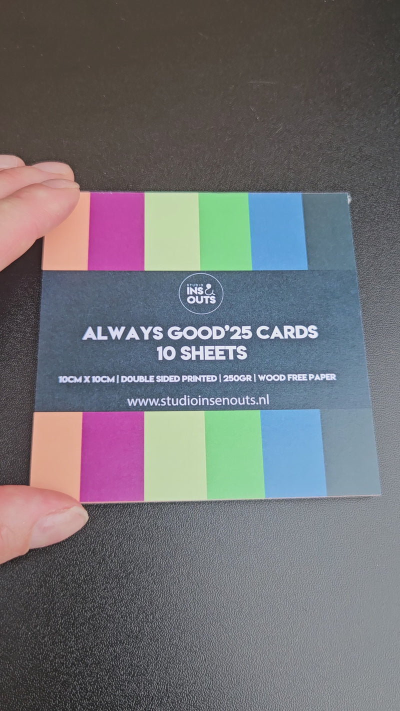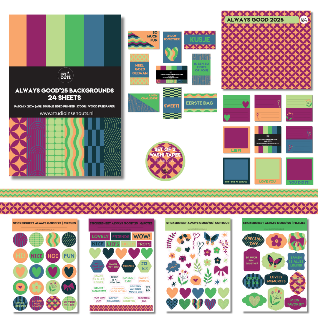 Dit is de complete set Always Good'25 voor abonnementhouders. Always Good heeft een verrassend kleurpalet met stoere paarse, oranje, groene en blauwe tinten. De printjes van het paperpad zijn krachtig en speels, ideaal om jouw projecten een frisse look te geven. De stickers uit het Always Good thema zitten vol vrolijke, lieve en praktische teksten en iconen die altijd van pas komen! En natuurlijk kunnen de quote kaartjes, polaroid kaartjes en washi tapes in dezelfde kleuren combi niet ontbreken!