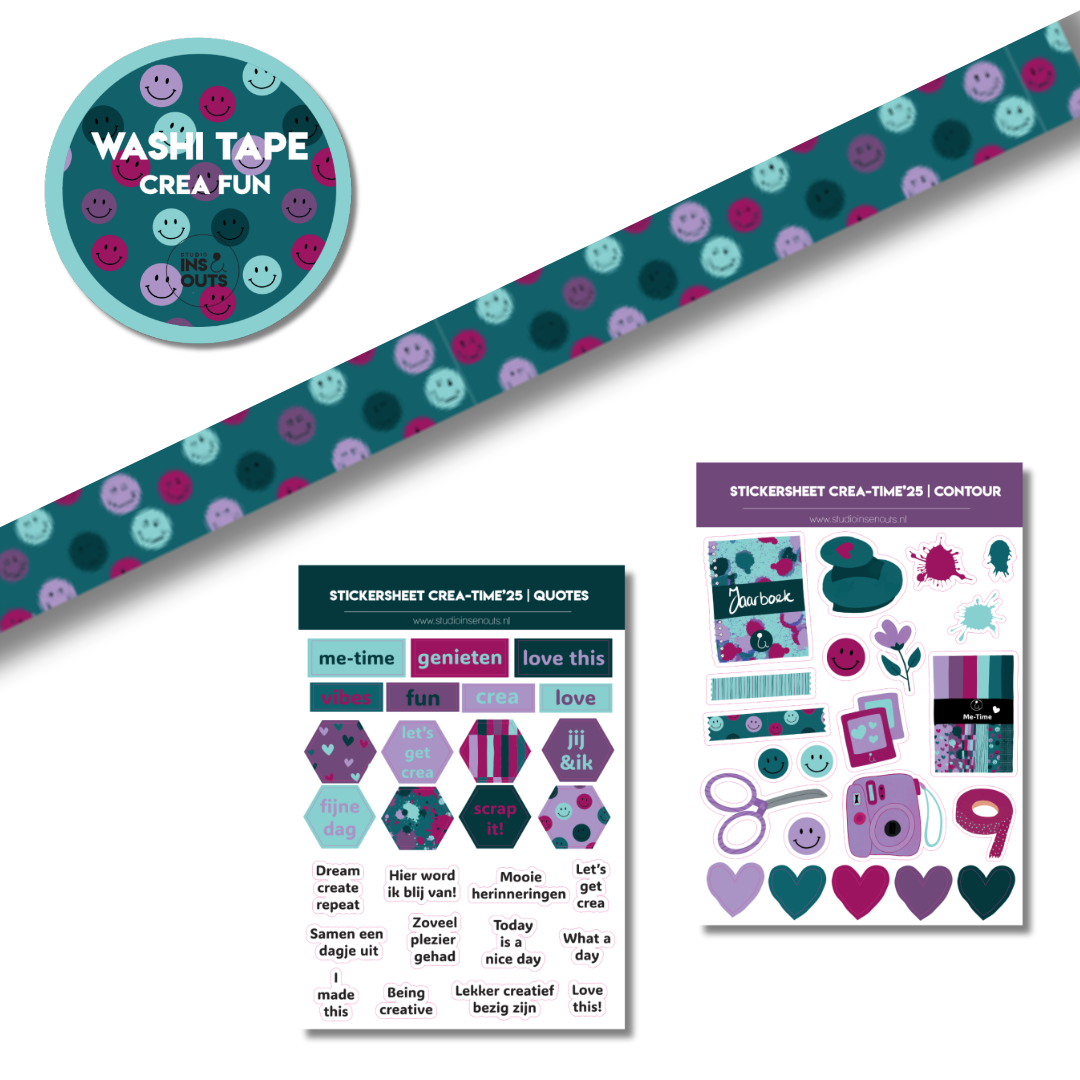 De Mini Collectie Crea-Time’25 van Studio Ins & Outs is speciaal ontworpen voor iedereen die graag creatief bezig is met journaling, scrapbooking of invulboeken. De set bevat twee unieke stickervellen en een brede washi tape van 1,5 cm. De kleurencombinatie van petrol, paars, bordeaux, lila en mintgroen sluit perfect aan bij de Me-Time’25 collectie.