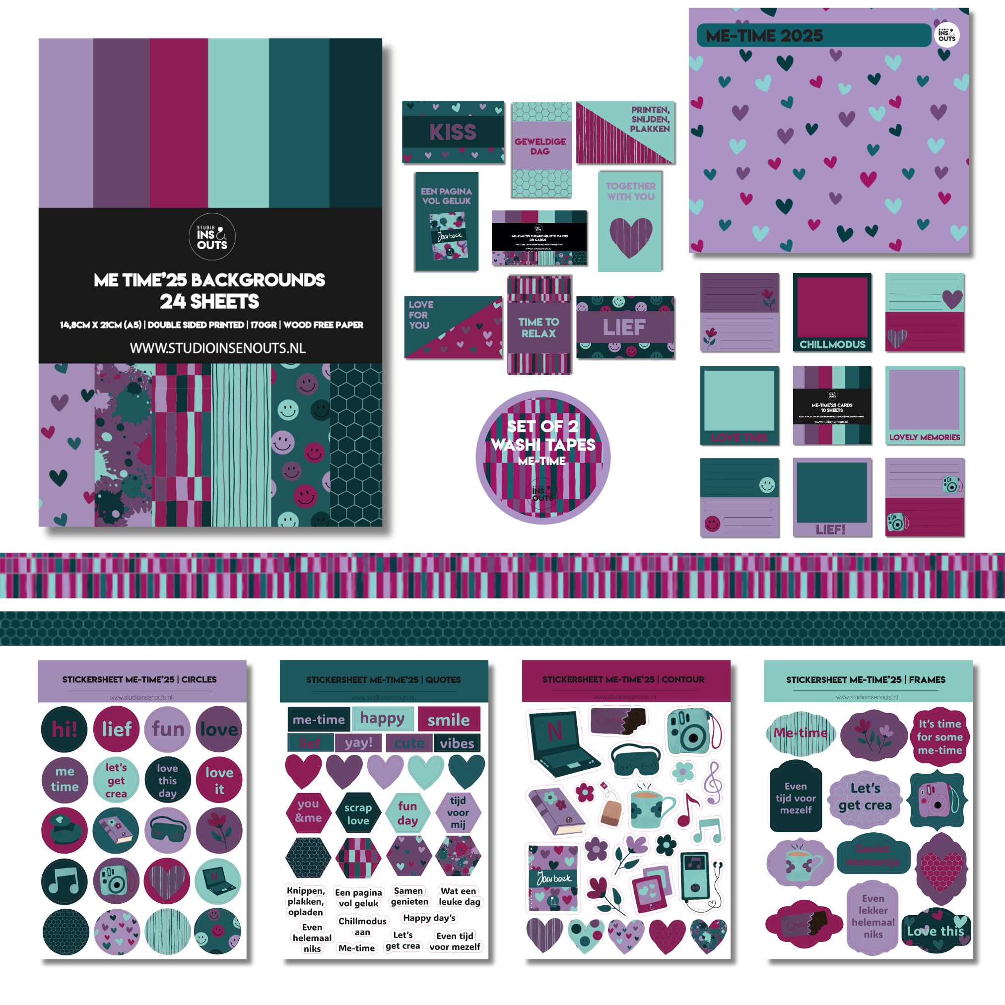 De collectie Me-Time’25 van Studio Ins & Outs is speciaal ontwikkeld voor iedereen die creativiteit wil combineren met ontspanning en selfcare. Met de harmonieuze mix van paars, lila, bordeaux, donkergroen, mintgroen en petrolgroen leg je herinneringen vast in een rustige en sfeervolle stijl. De prints en teksten zijn ontworpen om het thema me-time te benadrukken: tijd voor jezelf, relaxmomenten en kleine gelukjes. Deze complete set is daardoor ideaal als scrapbook pakket, journaling set of creatieve knutselset voor wie creativiteit wil gebruiken als manier om te ontspannen.