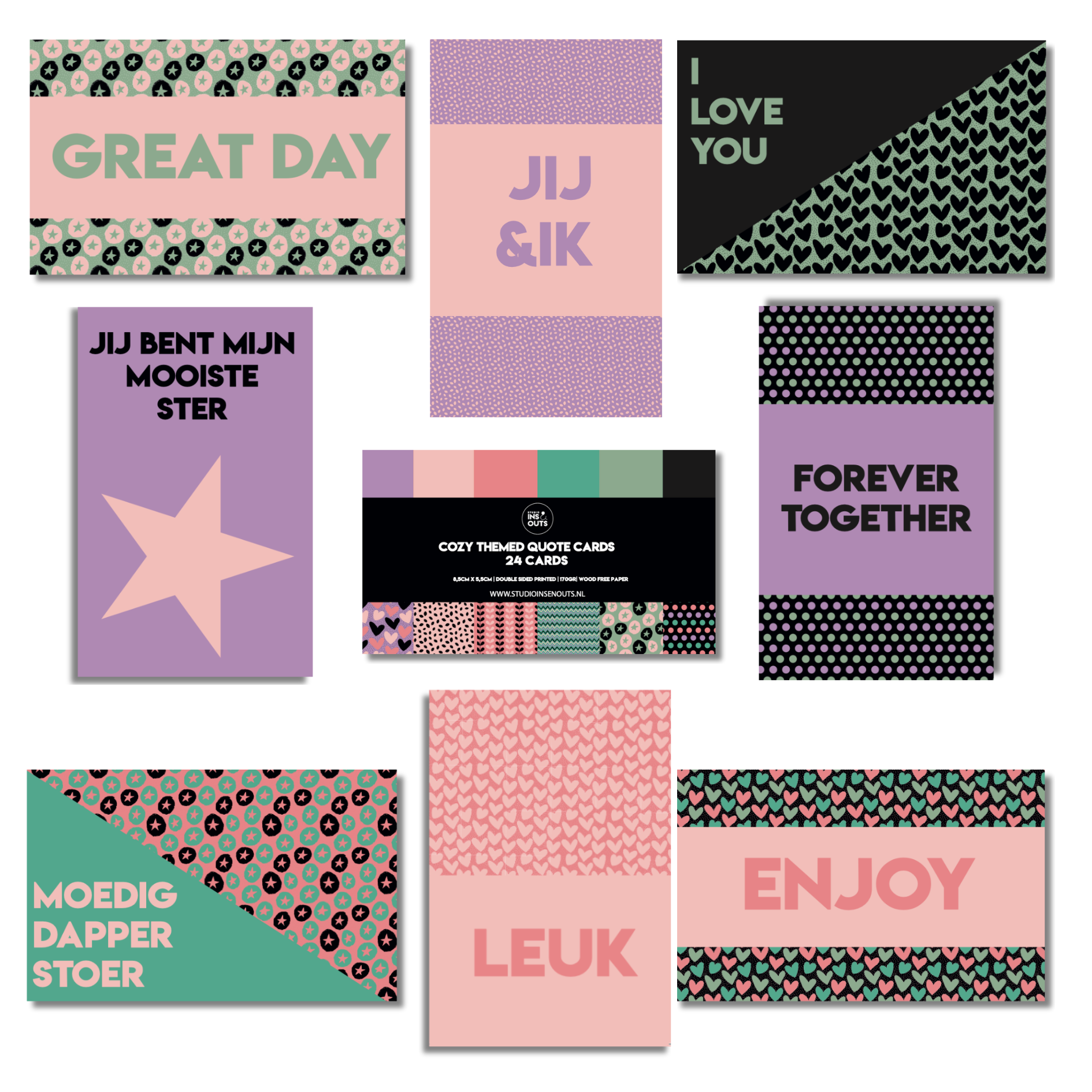 De set van 24 quote kaartjes bevat korte en inspirerende teksten in Nederlands en Engels, zoals "Forever Together" en "Jij bent mijn mooiste ster". De combinatie van frisse typografie en grafische patronen maakt ze ideaal om als eyecatcher op een pagina te gebruiken of om los te geven als klein kaartje.