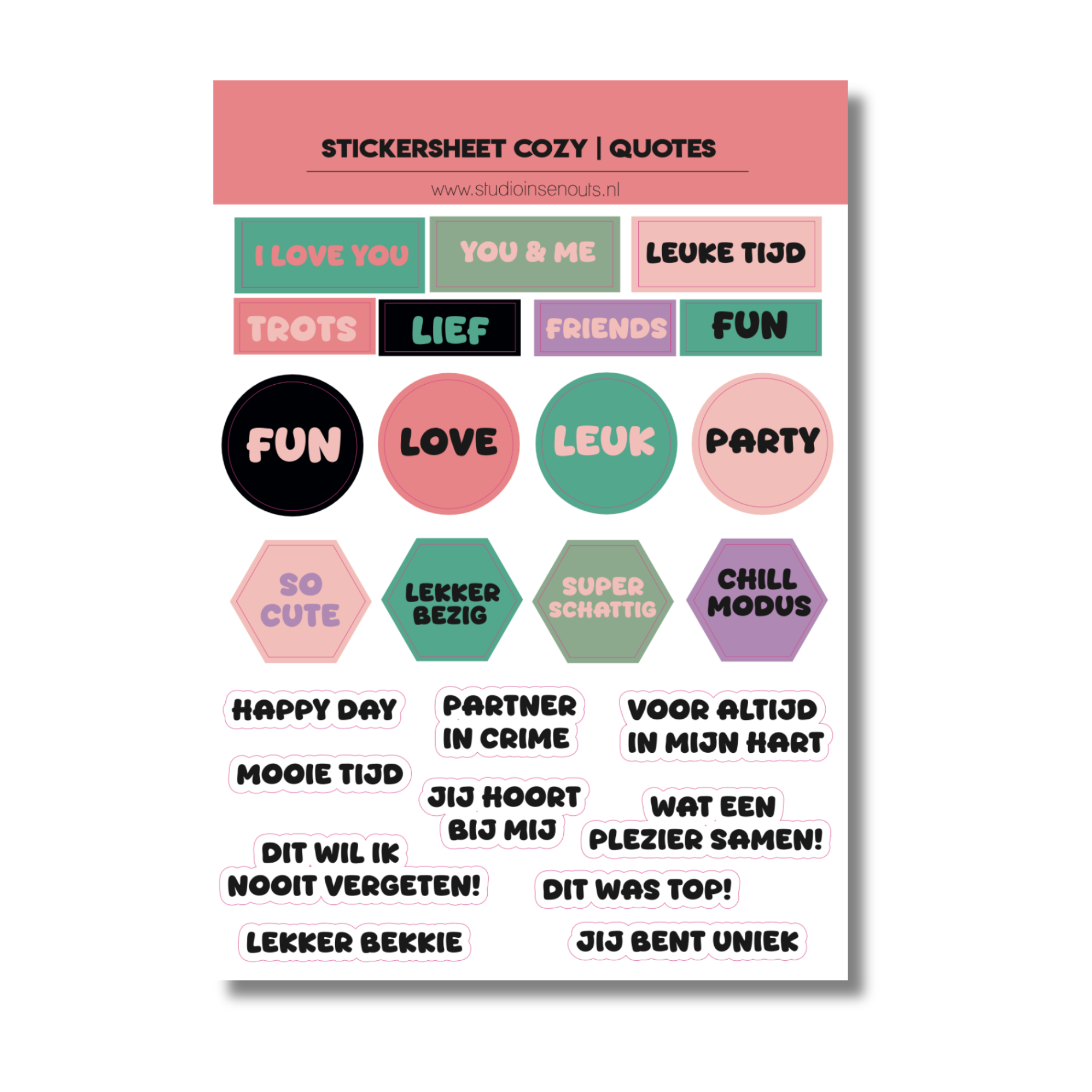 - Quotes: gezellige uitspraken en korte teksten in kleurrijke typografie.