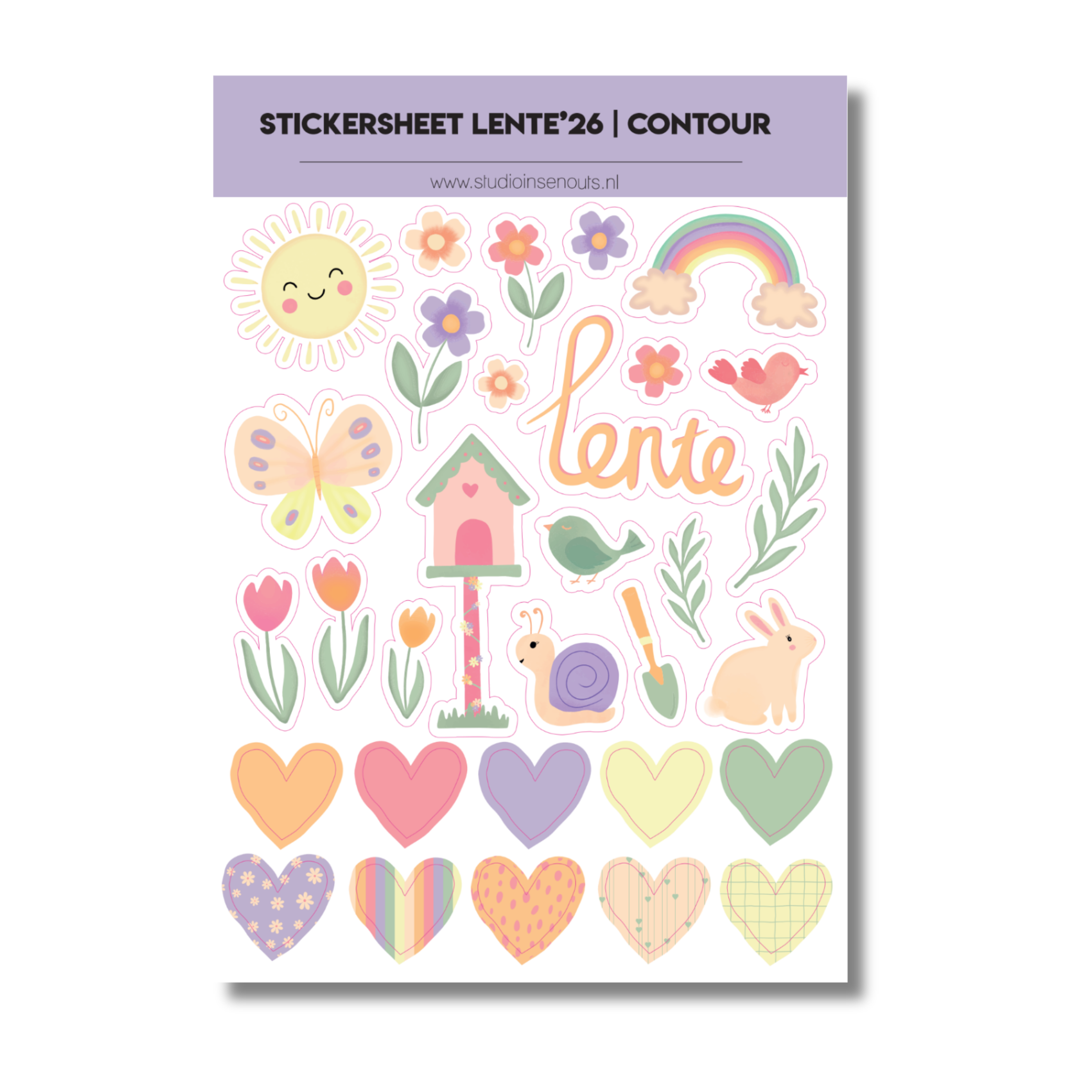 Het Stickervel Contour Lente’26 van Studio Ins & Outs staat helemaal in het teken van lente, buiten zijn en kleine geluksmomenten. Dit stickervel bevat een uitgebreide mix van contourstickers met vrolijke illustraties zoals bloemen, vlinders, zonnetjes, vogeltjes, hartjes, een konijntje, slak, regenboog en het woord “lente”. Perfect om lentemomenten en Paasherinneringen vast te leggen in je scrapbook, journal of invulboek.