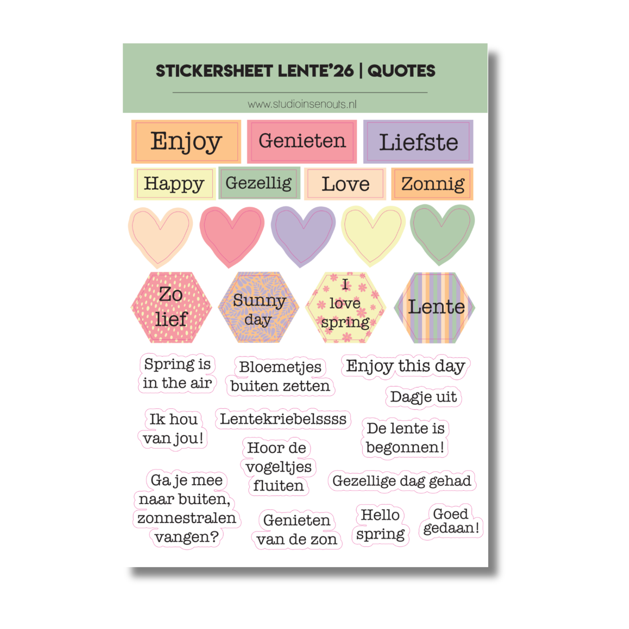 Het Stickervel Quotes Lente’26 van Studio Ins & Outs bestaat uit tekststickers met korte, vrolijke quotes die passen bij het voorjaar. De stickers zijn ontworpen voor het vastleggen van lentegevoel, kleine geluksmomenten en samen genieten. Ideaal voor gebruik in scrapbooks, invulboeken, fotoboeken, planners en journals waarin lente- en Paasmomenten centraal staan.