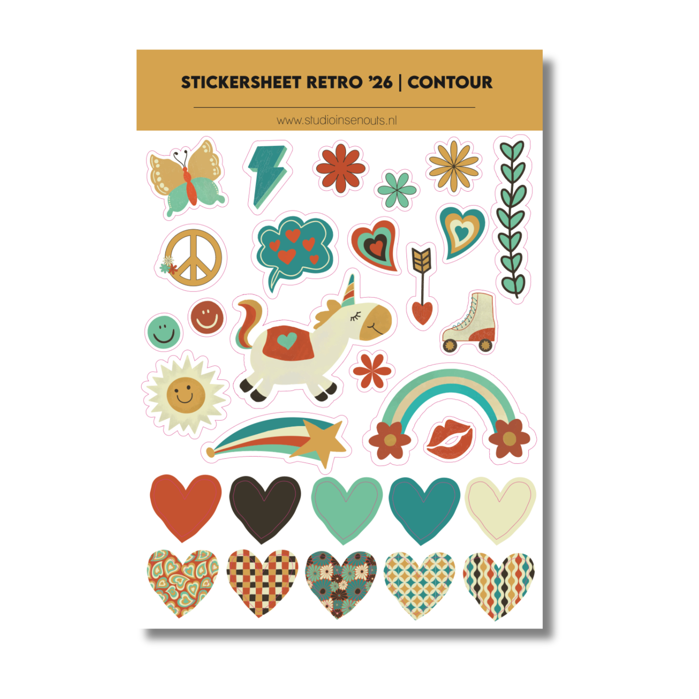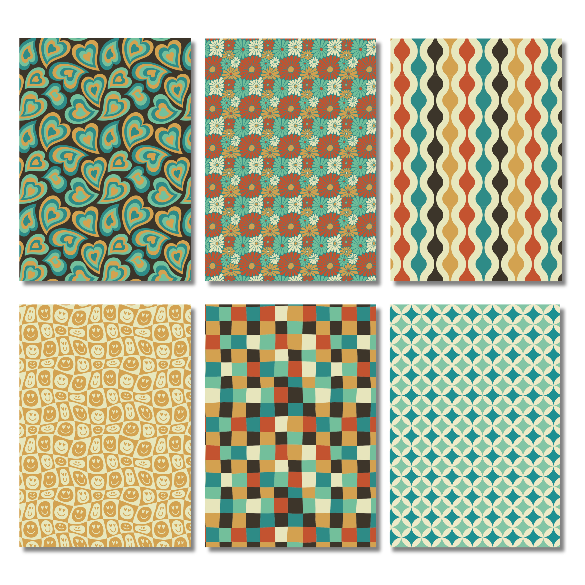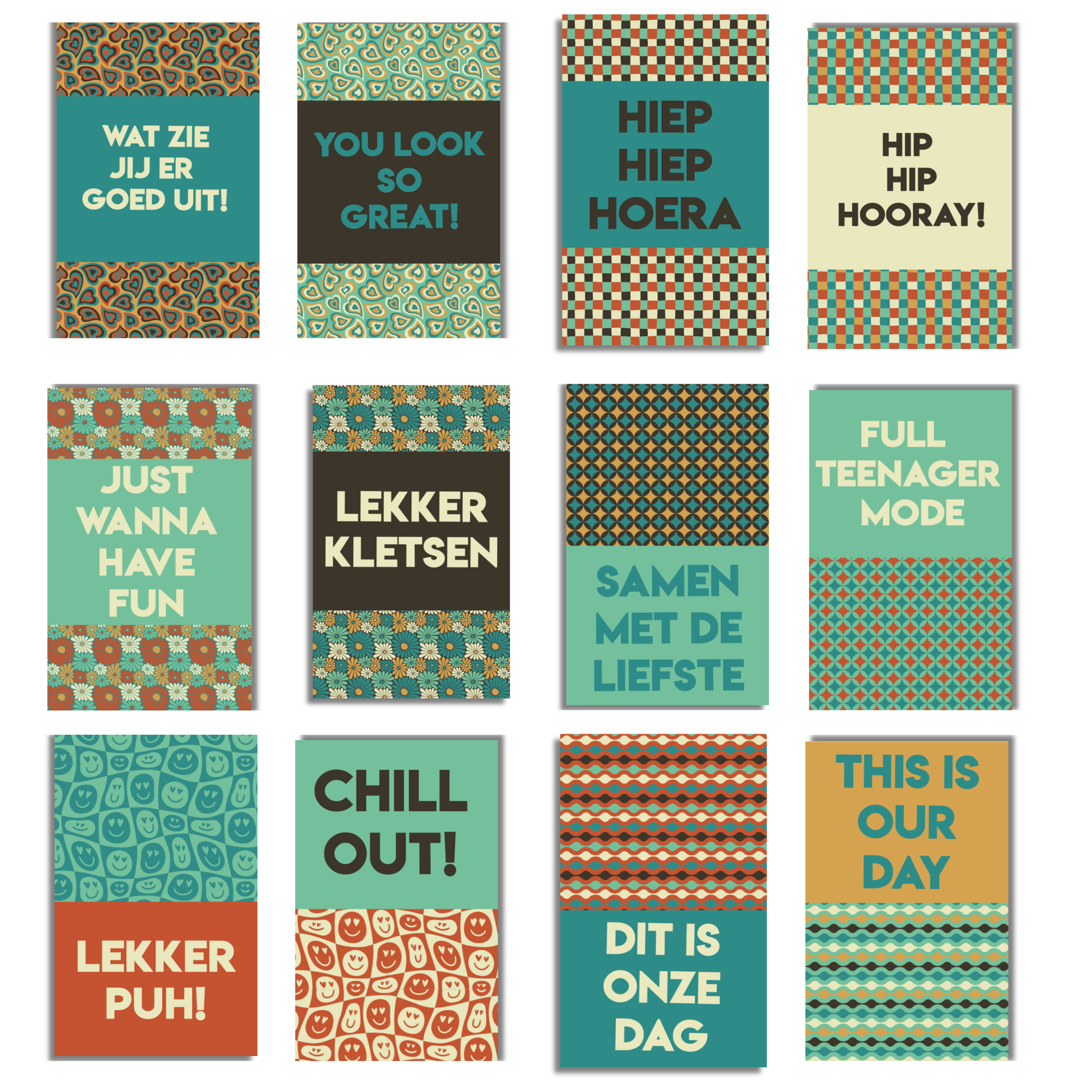 De Retro ’26 collectie bestaat uit warme retro kleuren zoals donkerbruin, petrol, crème, okergeel, terracotta en mintgroen. De patronen die je terugvindt zijn smileys, hartjes, bloemenprints, geometrische vormen, golvende lijnen en grafische retro dessins. Deze combinatie zorgt voor een herkenbare stijl die goed werkt bij foto’s, korte teksten en labels.