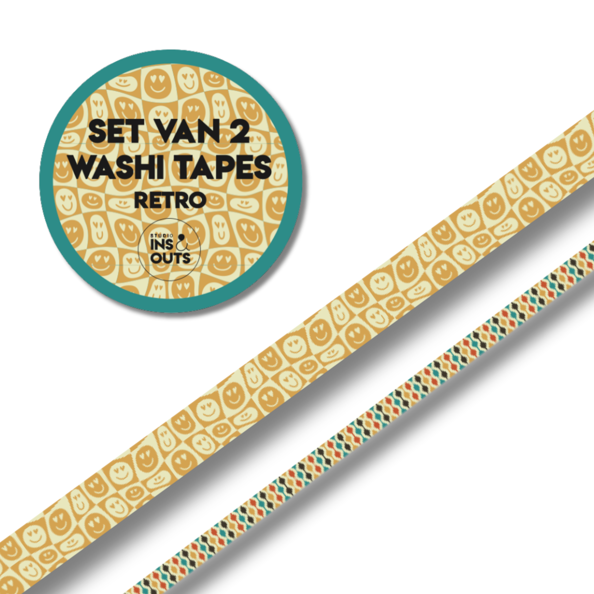 Washi tapes set van 2: Twee bijpassende tapes met smileyprint (1 cm) en retro patroon (0,5 cm), geschikt voor randen, accenten en het vastzetten van foto’s.