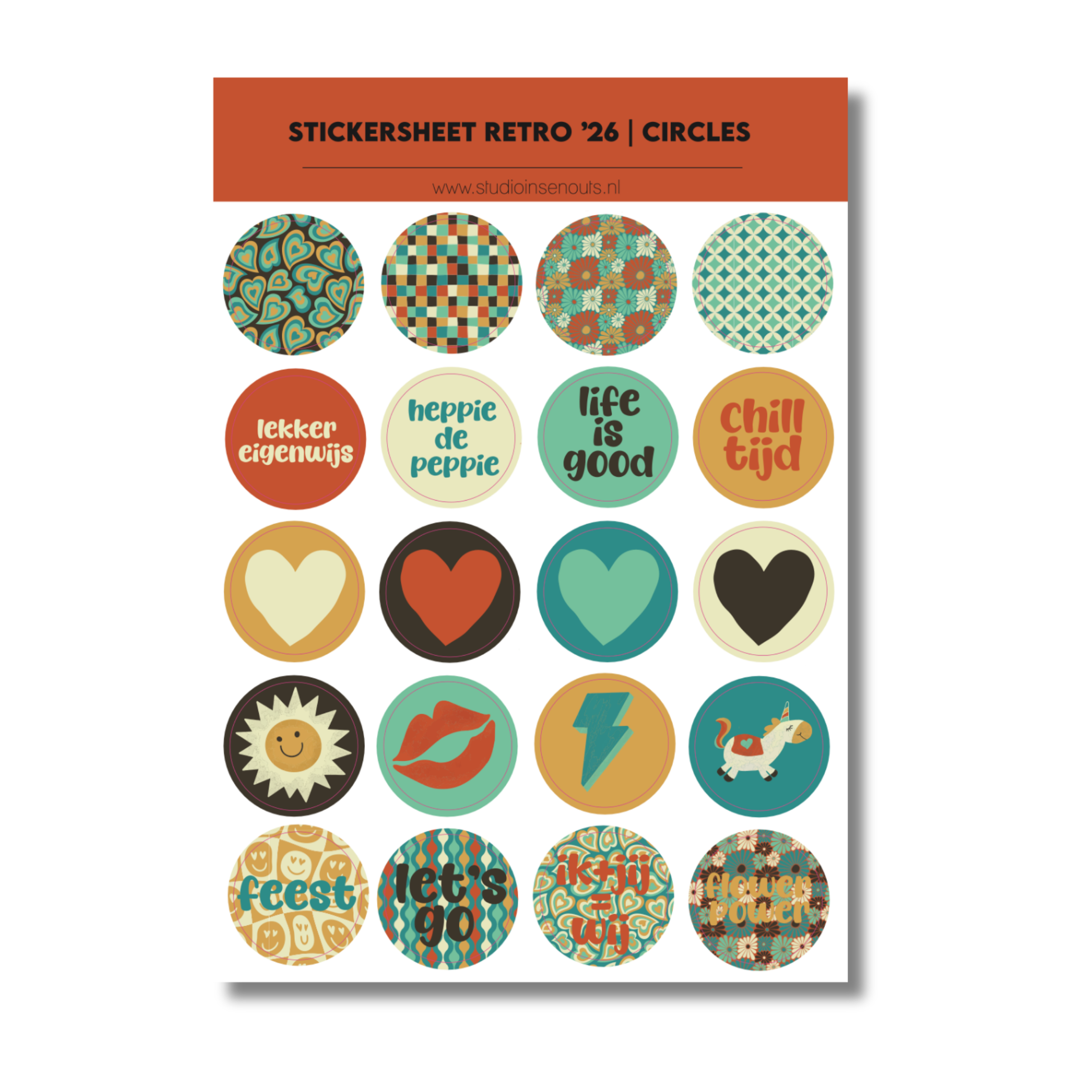 Stickervellen: 4 vellen (circles, quotes, contour en frames & fun) met smileys, hartjes, labels, woorden en illustraties die aansluiten bij het retro thema.