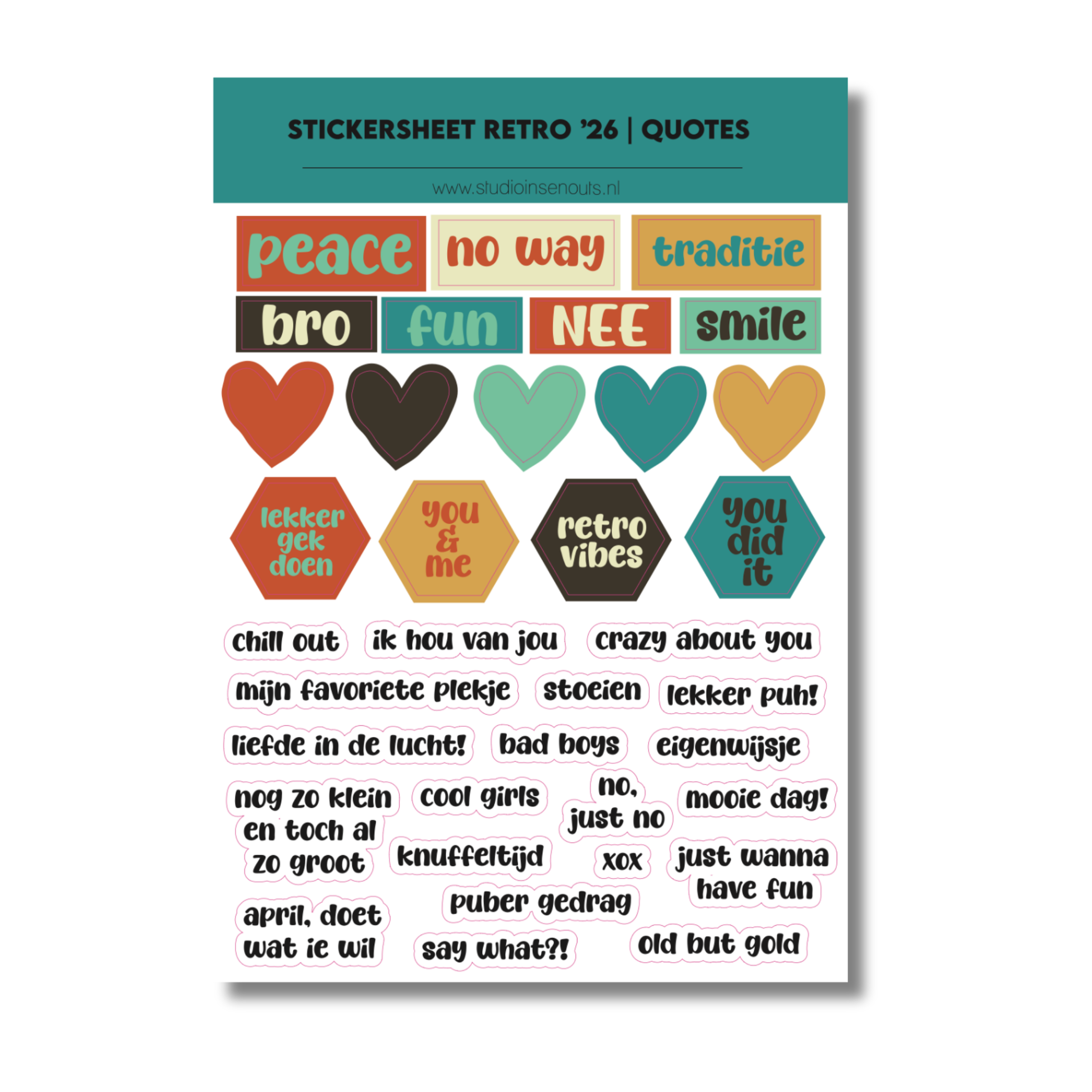 De Retro ’26 collectie van Studio Ins & Outs is een complete scrapbook set met een duidelijke retro en eigenwijze uitstraling. Deze set is samengesteld voor pagina’s over feestjes, vriendschap, tienermomenten en dagelijkse herinneringen. De collectie bevat een paperpad, stickers, washi tapes en kaartjes in een herkenbaar kleurenpalet van donkerbruin, petrol, crème, okergeel, terracotta en mintgroen. Geschikt voor scrapbooking, journaling, invulboeken en fotoboeken.
