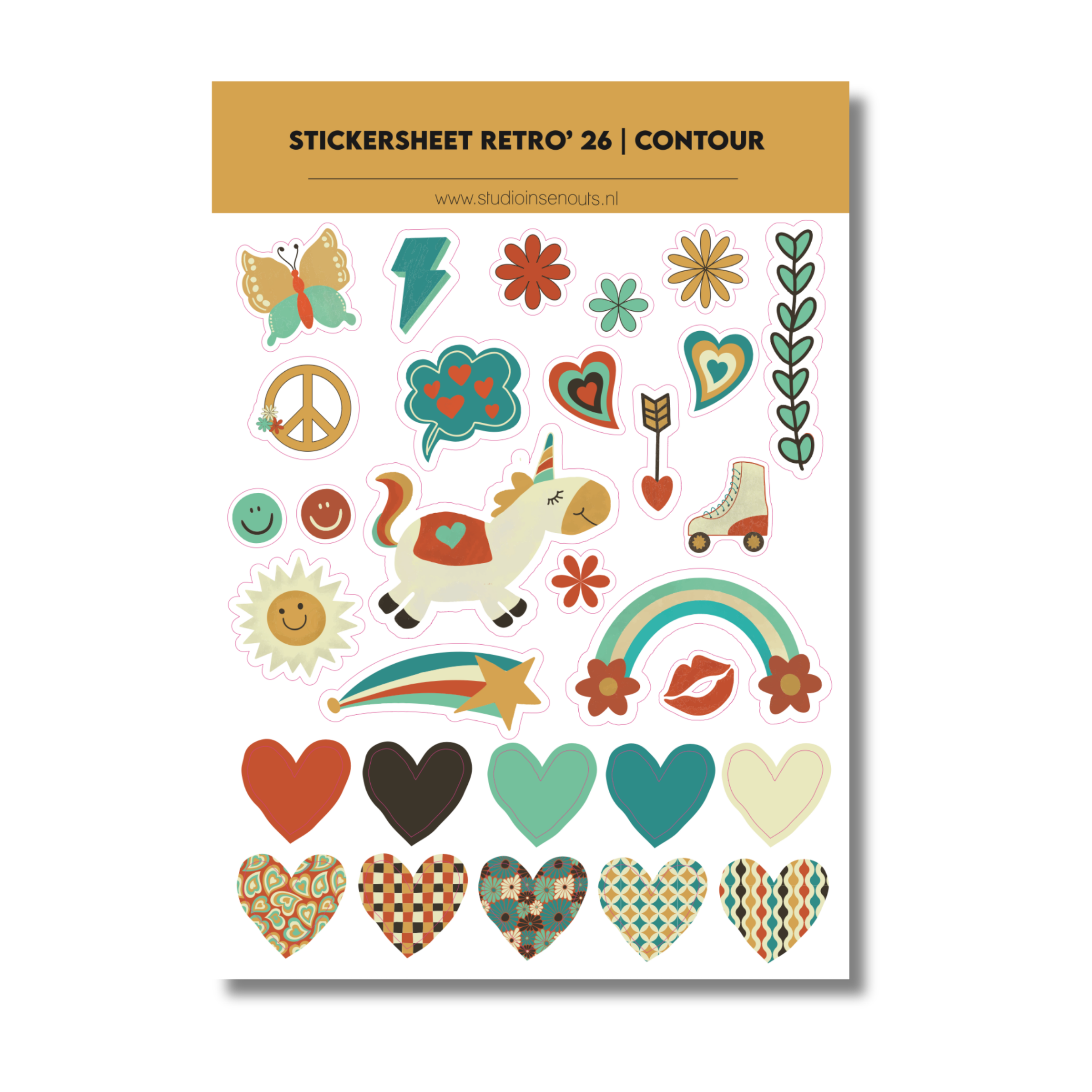 Het Stickervel Contour Retro ’26 van Studio Ins & Outs staat in het teken van retro illustraties, eigenwijze details en speelse herinneringen. Dit stickervel bevat een uitgebreide mix van contourstickers met retro afbeeldingen zoals bloemen, smileys, hartjes, eenhoorn, regenboog, peace-teken, lipjes, sterretjes en grafische vormen. Perfect om feestjes, tienermomenten en leuke herinneringen vast te leggen in je scrapbook, journal of invulboek met een duidelijke retro stijl.