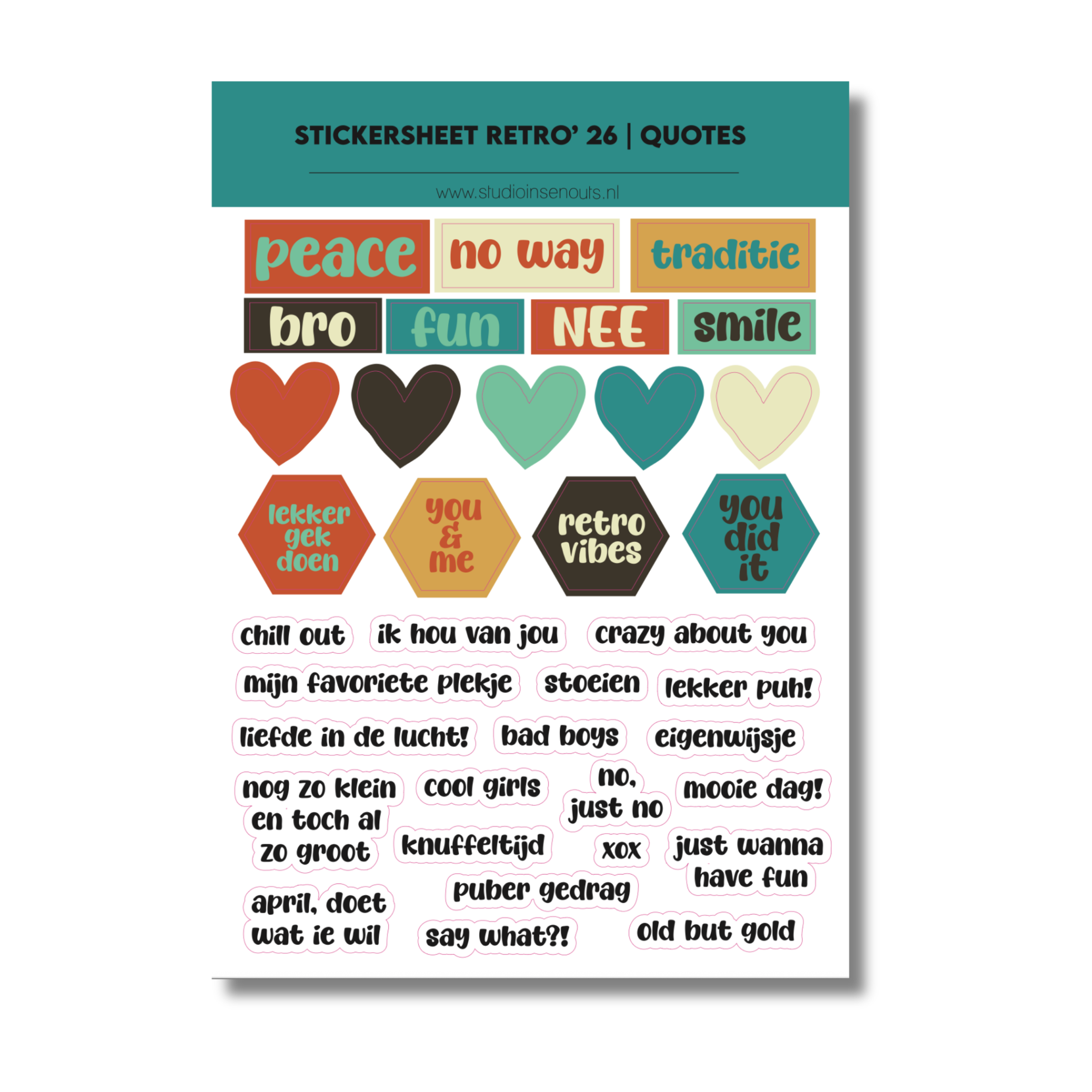 Het Stickervel Quotes Retro ’26 van Studio Ins & Outs bestaat uit tekststickers met korte retro quotes en eigenwijze teksten. De stickers zijn ontworpen om herinneringen, feestjes en dagelijkse momenten een speelse retro uitstraling te geven. Ideaal voor gebruik in scrapbooks, invulboeken, fotoboeken, planners en journals waarin humor, vriendschap en retro vibes centraal staan.