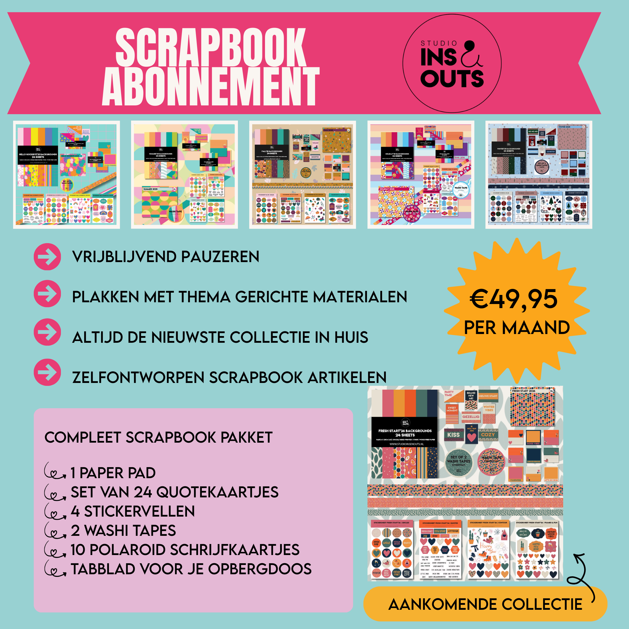 Hoe werkt het? Je meldt je aan via de website door het abonnement aan te schaffen. Dit is meteen je betaling voor de eerst volgende collectie (Complete set Fresh Start'26). Je kunt altijd vrijblijvend pauzeren en zit nergens aan vast!