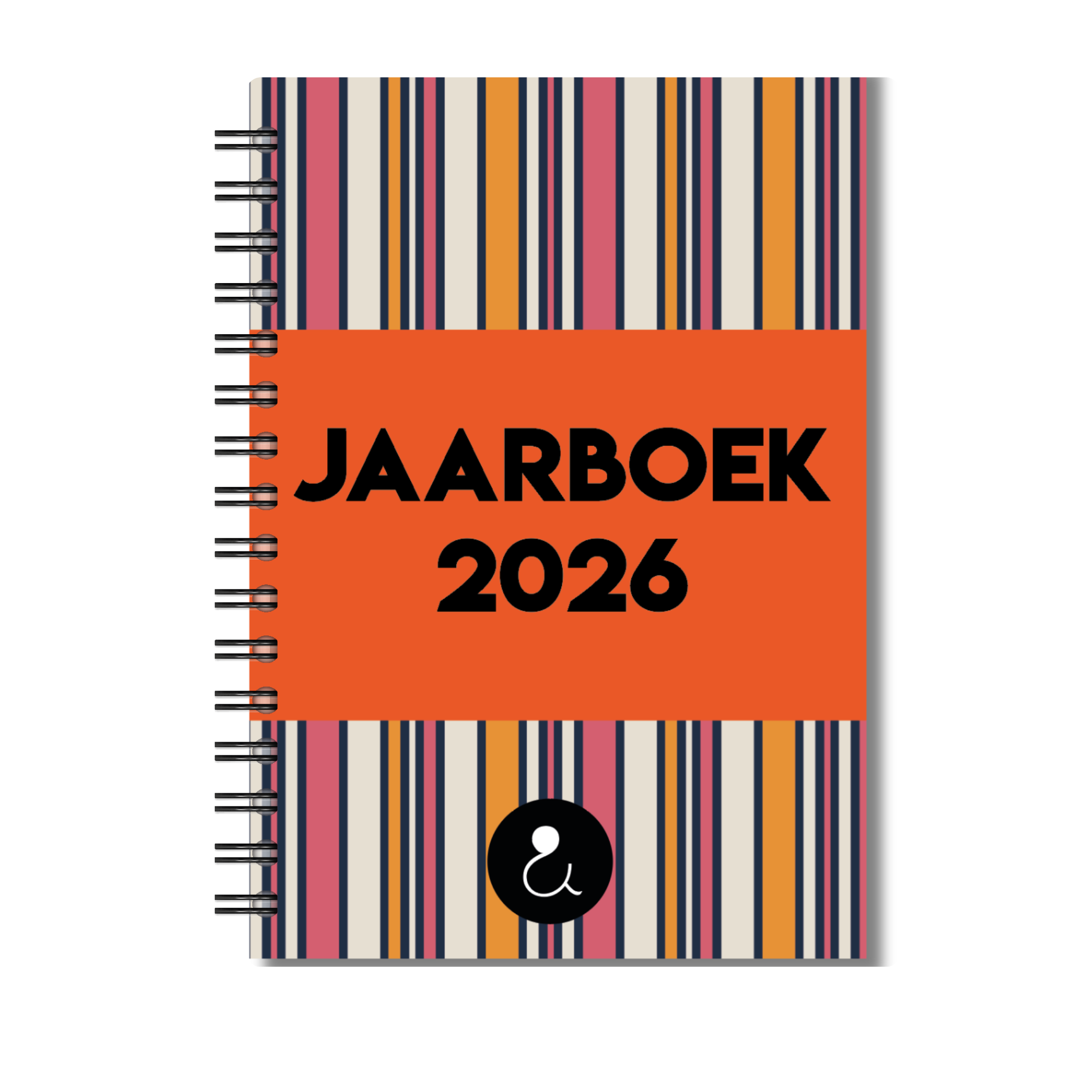 Jaarboek 2026 A5 | Blanco Jaarboek A5 2026 | Fotoboekje Jaarboek | 14,8x21cm | Strepen Oranje Roze