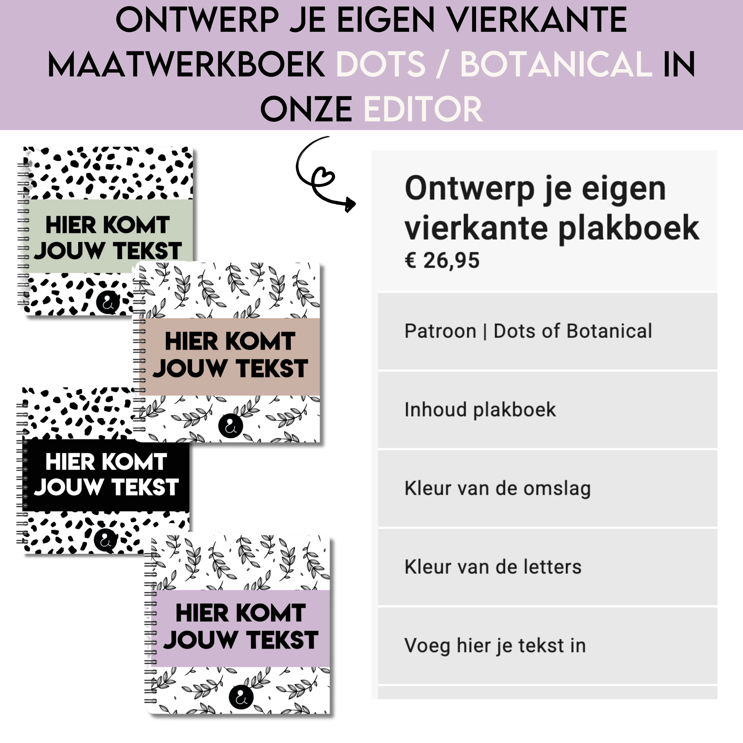 Ontwerp je eigen vierkante plakboek in onze maatwerk scrapbook editor. Kies je eigen print, kleuren en tekst voor een persoonlijk fotoboek op maat.