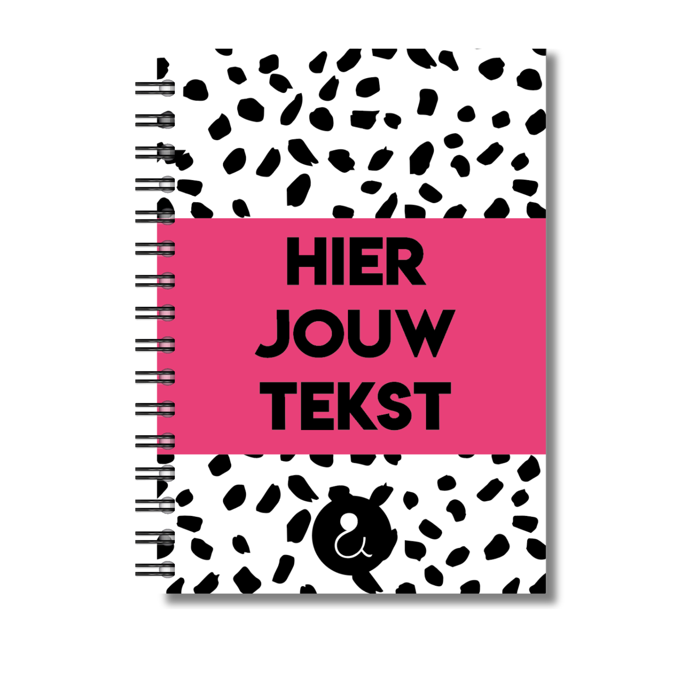 Dit gepersonaliseerde fotoboek A5 heeft een witte kaft met zwarte bladeren en een roze band waarop je eigen tekst komt te staan. Het compacte boek met ringband bevat stevige, blanco pagina’s van dik papier – ideaal voor foto’s, knipsels, tekeningen of notities. Door het handzame formaat neem je het makkelijk mee of geef je het cadeau. Voeg je naam of korte tekst toe en maak van dit kleine fotoboek een persoonlijk plakboek of scrapbook voor elk moment.