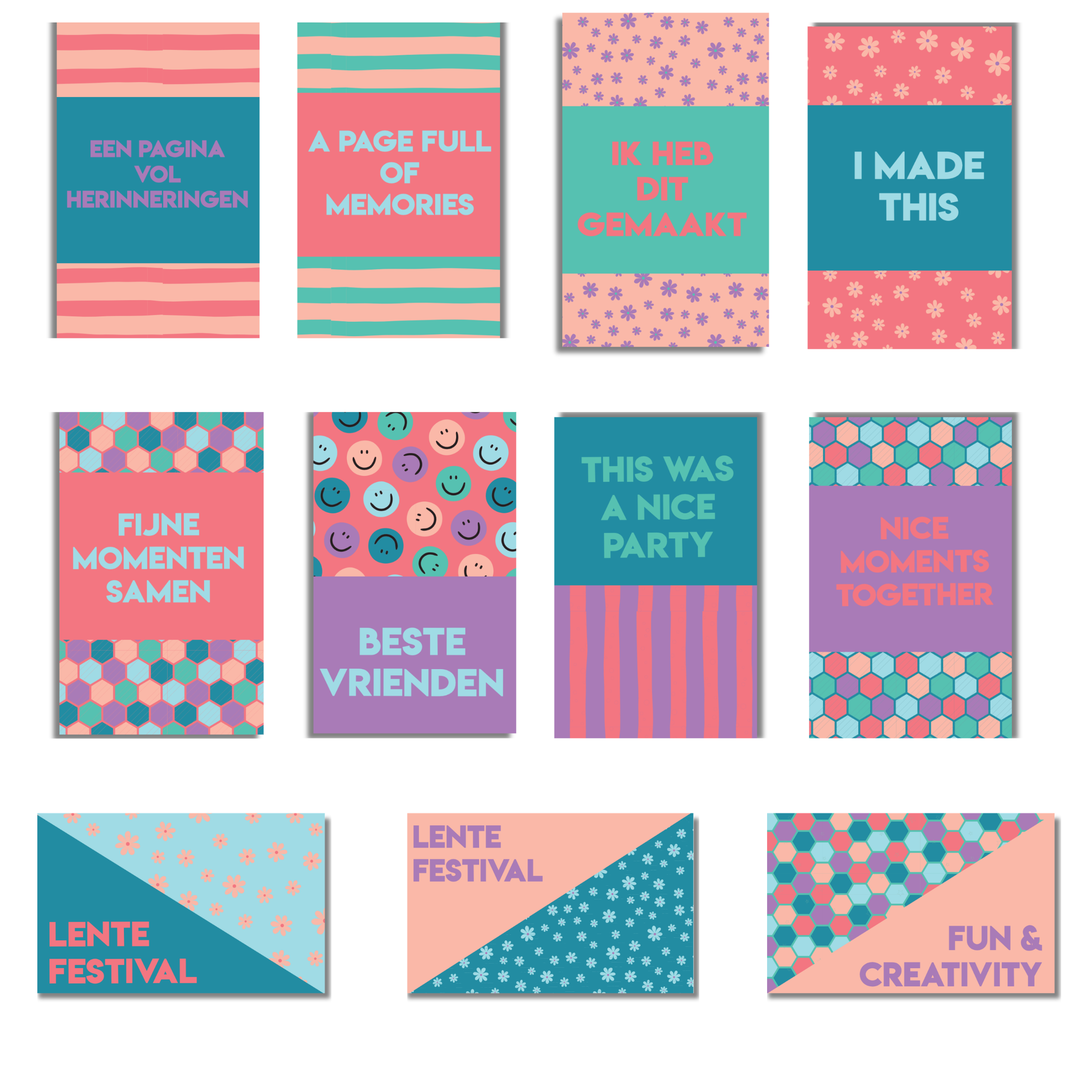 De Lentefestival quotekaartjes zijn geschikt voor pagina’s over creatieve dagen, workshops, beursbezoeken, vriendinnenuitjes en lente-evenementen. Korte teksten geven je pagina direct een duidelijke titel of extra context zonder dat je veel hoeft te schrijven. Gebruik ze als label, accent of blikvanger op je scrapbookpagina’s en combineer ze met foto’s van je creatieve projecten of gezellige momenten.
