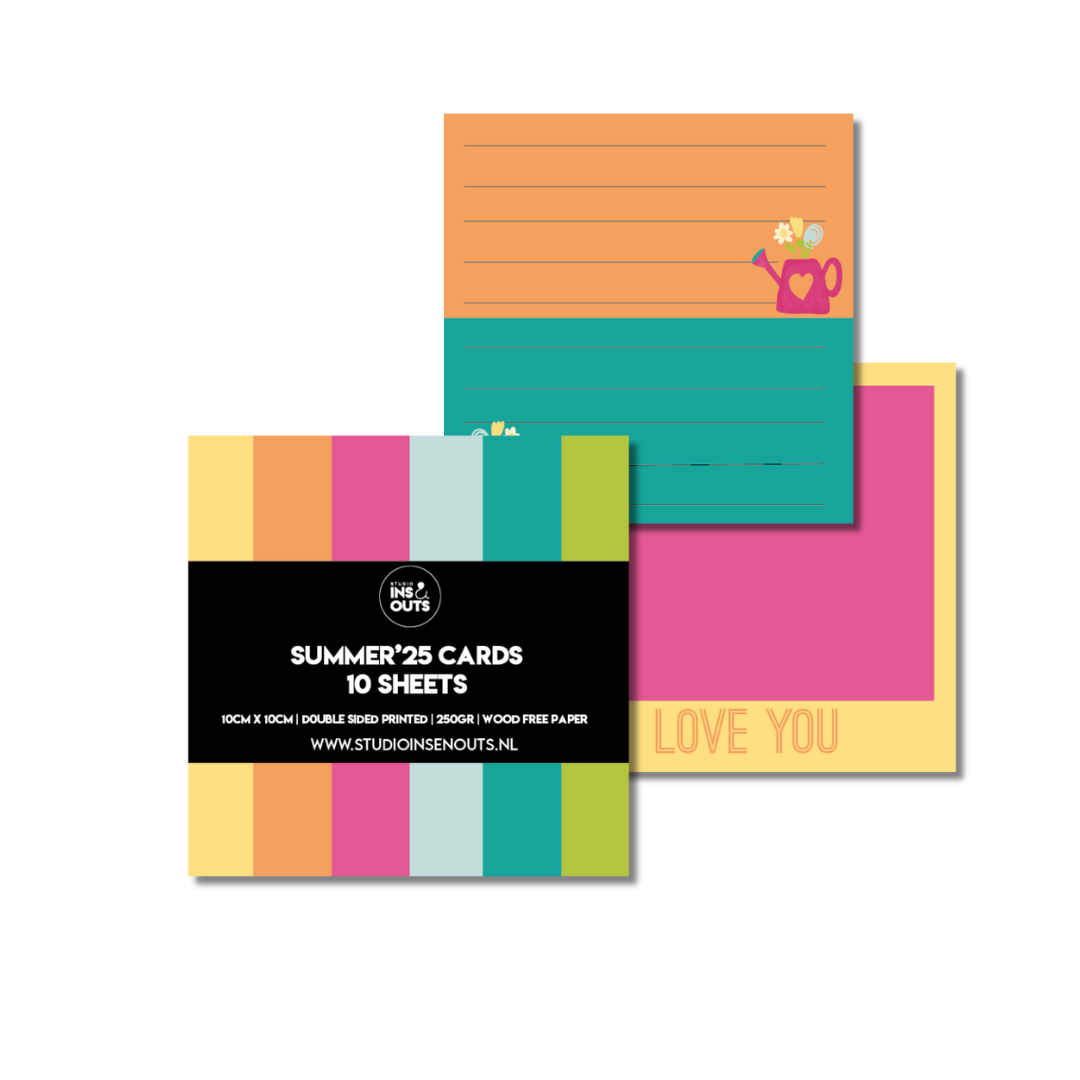 Vrolijke polaroid kaartjes uit de Summer’25 collectie van Studio Ins & Outs! Deze set bestaat uit 10 stevige kaartjes van 10x10 cm, perfect om te gebruiken in je invulboek of plakboek om bijzondere momenten vast te leggen, persoonlijke notities te schrijven of creatief aan de slag te gaan in je scrapbook of journal. De ene zijde van elk kaartje bevat fijne schrijflijntjes en een unieke illustratie of zomerse quote, zoals een gieter met bloemen of de tekst “LOVE YOU”. Op de andere zijde is ruimte voor een foto of extra notitie, steeds in een kleurrijk ontwerp. De kleuren die gebruikt worden bij de polaroid kaartjes Summer’25 zijn geel, oranje, roze, lichtblauw, turquoise en groen.