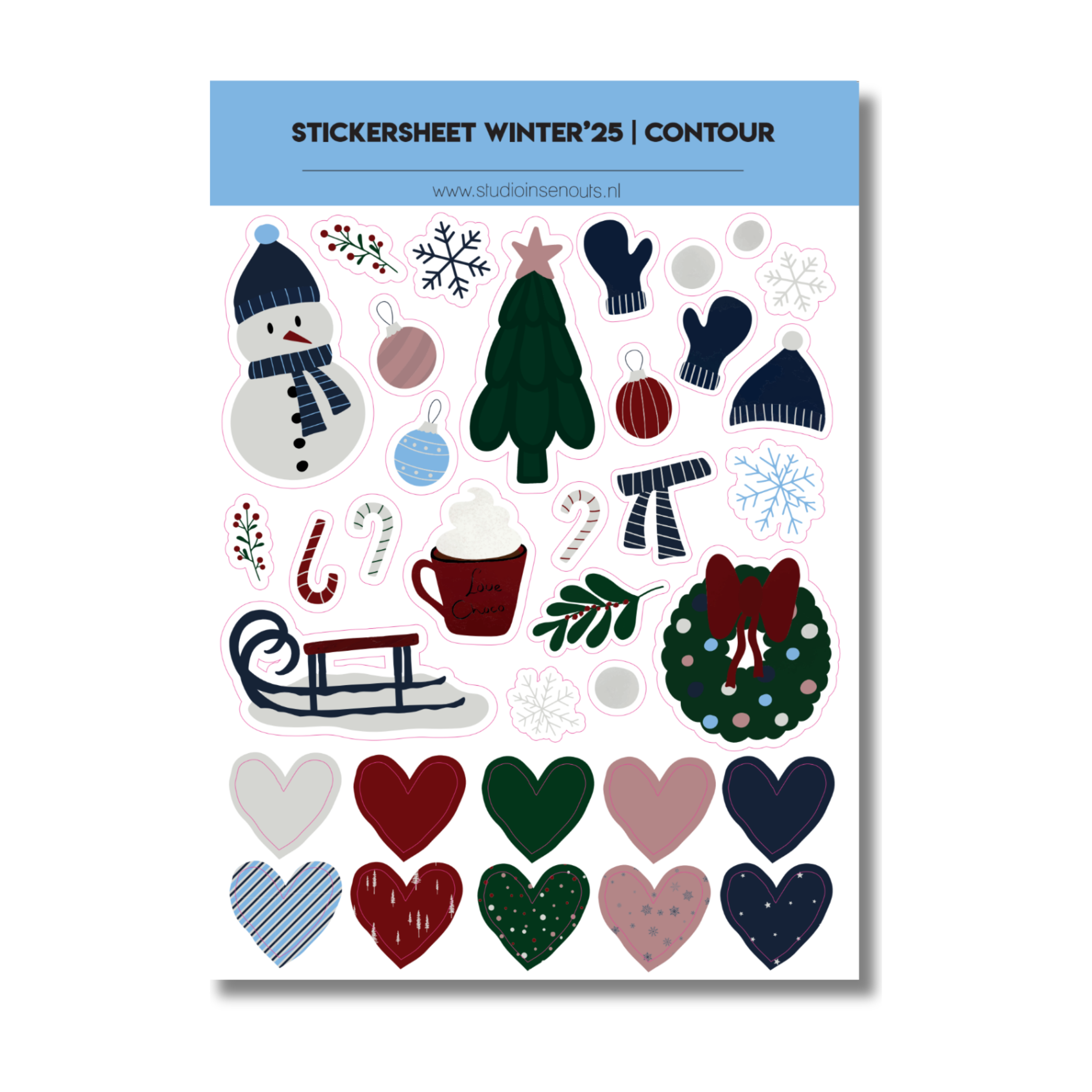 Breng de winter tot leven in je foto plakboek, invulboek, scrapbook, planner of journal met het Stickervel Contour Winter ’25 van Studio Ins & Outs. Dit stickervel bevat 34 vrolijke stickers met winterse illustraties zoals een sneeuwpop, kerstboom, slee, wanten, mutsen, kerstballen, hulsttakken en hartjes. Perfect om je creatieve pagina’s een gezellige en feestelijke uitstraling te geven.