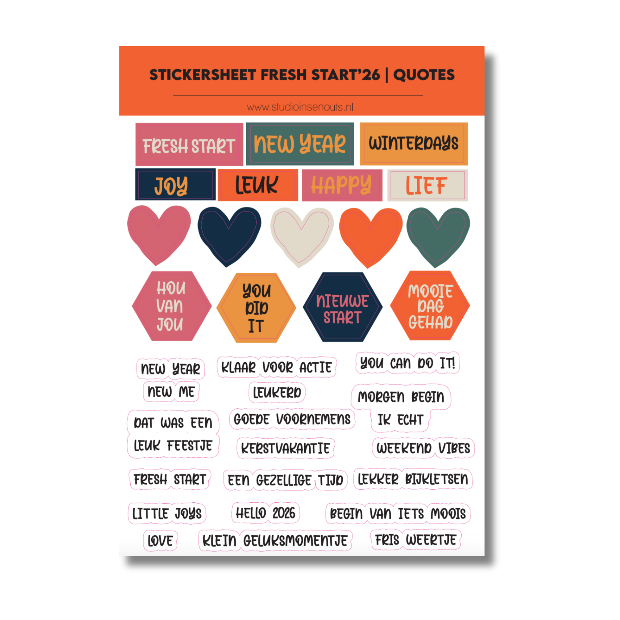 Het Stickervel Quotes Fresh Start’26 van Studio Ins & Outs staat in het teken van een nieuwe start, frisse energie en het begin van een kleurrijk nieuw jaar. Dit stickervel bevat een vrolijke mix van tekststickers, hexagon stickers en hartjes in de kenmerkende Fresh Start-kleuren: crème, roze, oranje, geel, groen en donkerblauw. De teksten en vormen sluiten perfect aan bij thema’s zoals vernieuwing, motivatie en winter vibes.
